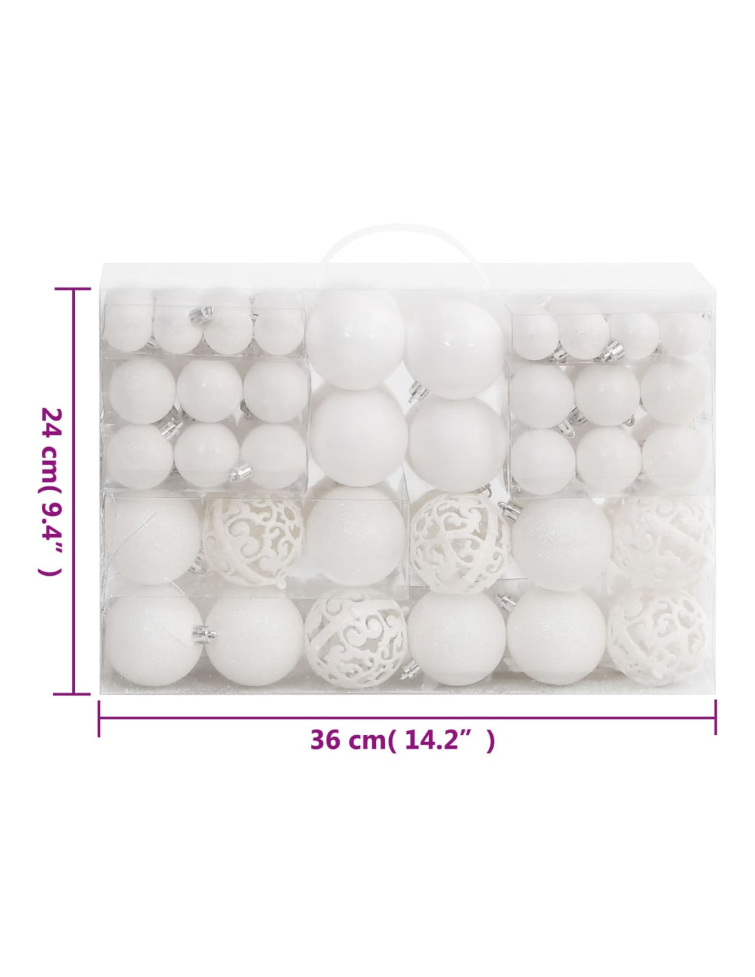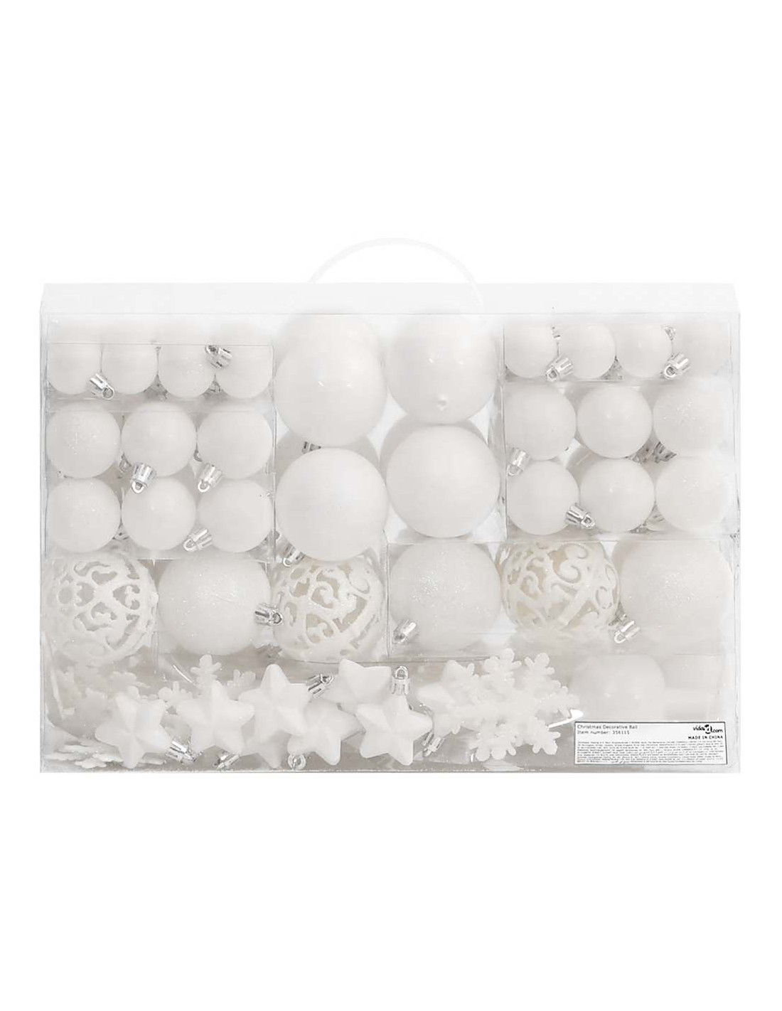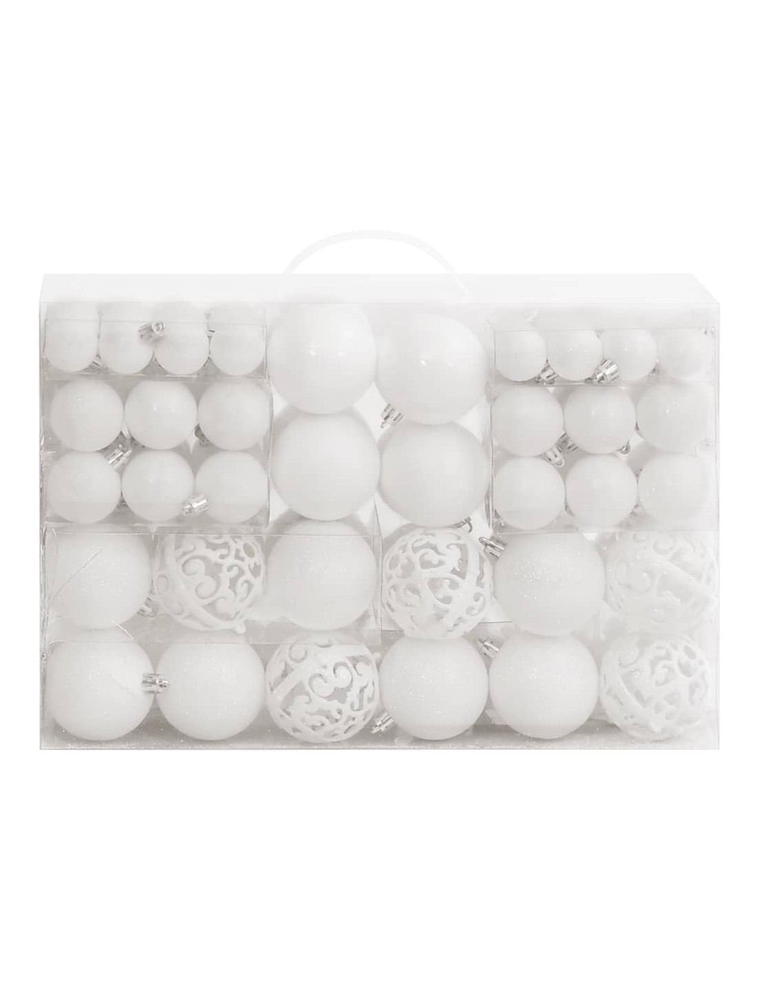 - Vari stili e dimensioni: Questa collezione di palline di Natale comprende palline di tre diametri (3 cm, 4 cm, e 6 cm), fiocchi di neve, stelle, e un puntale. Queste palline presentano quattro stili (opaco, brillantinato, lucido, e traforato).