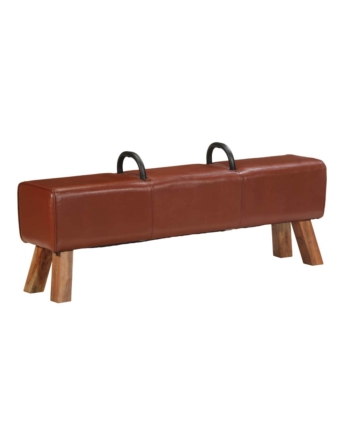 La nostra panca in stile ginnastica della vecchia scuola è sicuramente un pezzo unico e significa attirare l'attenzione nella vostra casa o in altri spazi. Le eleganti maniglie in metallo formano un ottimo contrasto visivo con il rivestimento in vera pelle di capra.