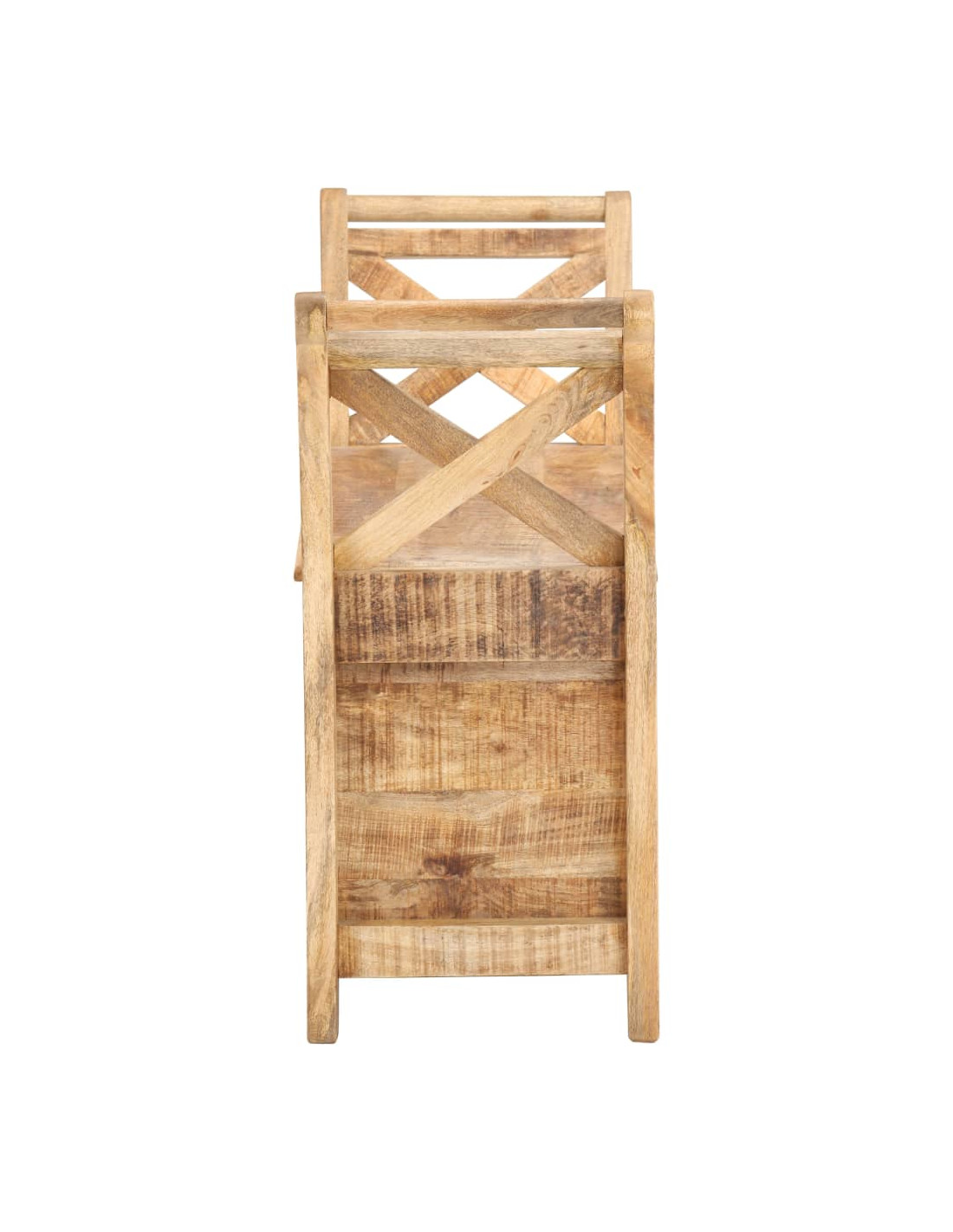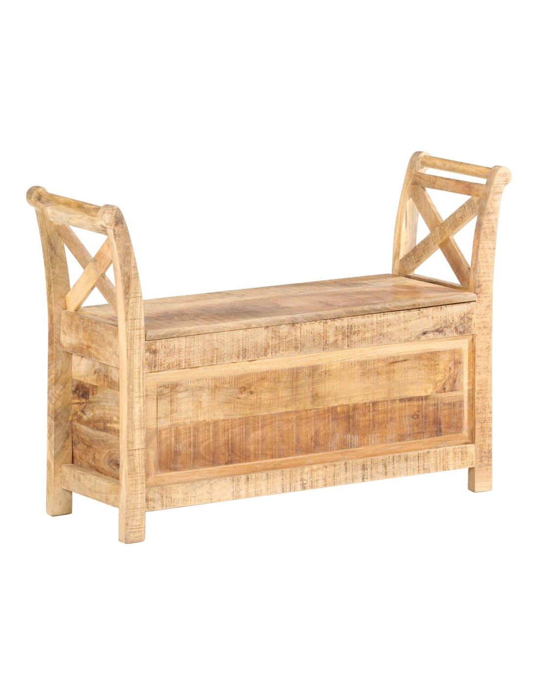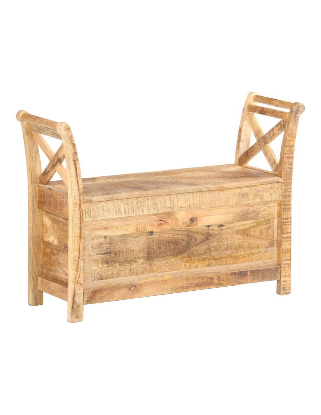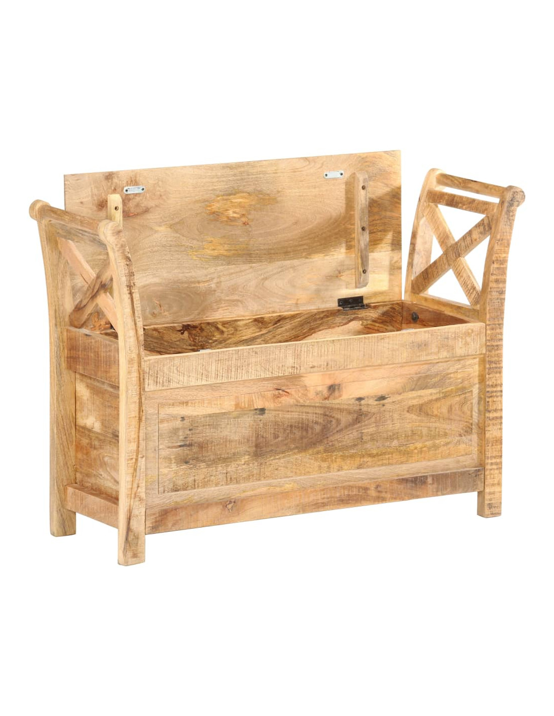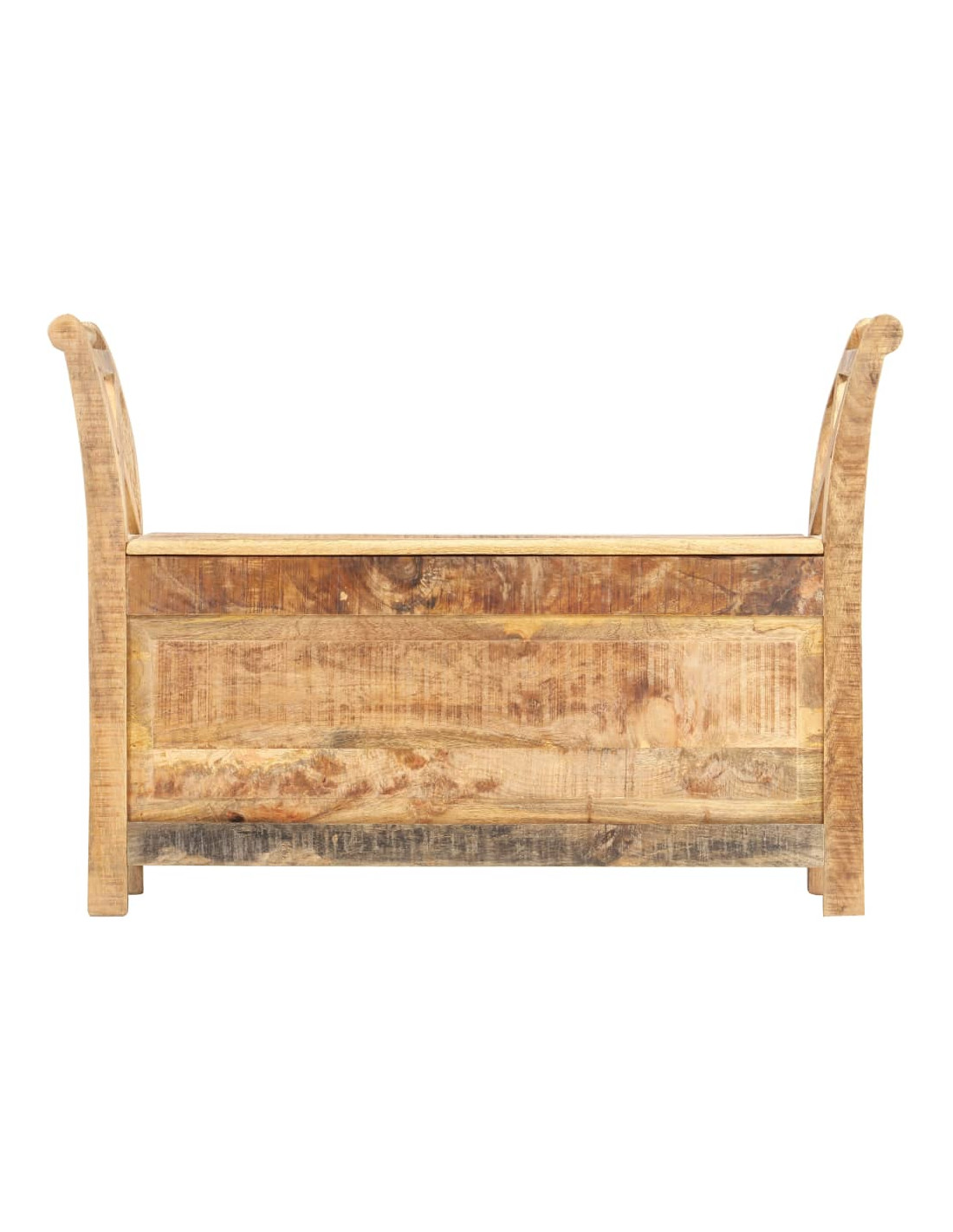 La panca è realizzata in legno robusto di mango, un legno duro con venature dense. Il legno di mango grezzo non solo ha la forza di sopportare il peso, ma resiste anche all'usura del tempo. Di conseguenza, questa panca da ingresso dal design accattivante è notevolmente stabile, resistente e attira l'attenzione. La panca ha 2 braccioli curvi per protezione e maggiore eleganza. Lo scomparto di stoccaggio consente di posizionare cuscini, giocattoli, cuscini e altri elementi essenziali al di sotto e di mantenere tutti gli oggetti in ordine. L'artigianalità e le eleganti venature del legno rendono ogni mobile distintivo e leggermente diverso dall'altro. La panca dell'ingresso è facile da montare.
