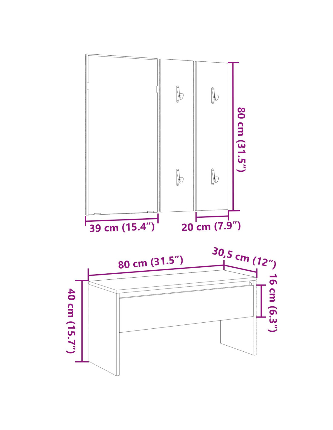 - Soluzioni di stoccaggio pratiche Questo set è progettato per la funzionalità, offrendo ampio stoccaggio con cassetti in legno ingegnerizzato e scomparti. Questi spazi sono ideali per riporre scarpe, borse o accessori, aiutando a mantenere l'ingresso libero dal disordine.