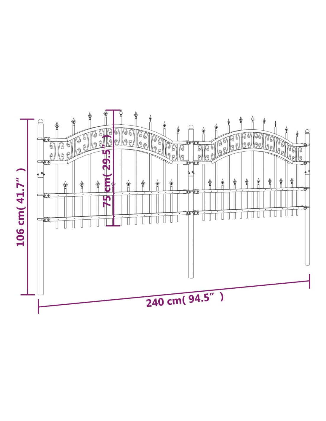 - Design di alta sicurezza: La recinzione in metallo fornisce un alto grado di sicurezza, grazie all'elegante design ad arco della parte superiore e ai robusti sostegni orizzontali che rinforzano il telaio e formano un'incredibile barriera per la vostra proprietà.