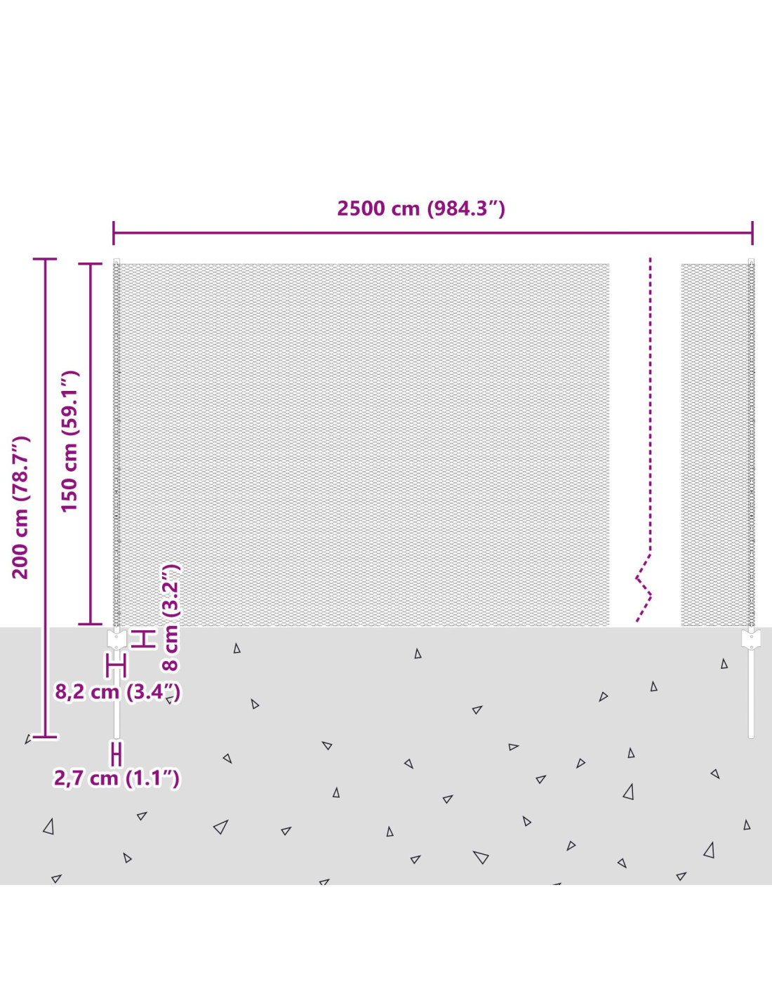- Dimensioni complessive: 2500 x 2,7 x 150 cm (L x P x A)