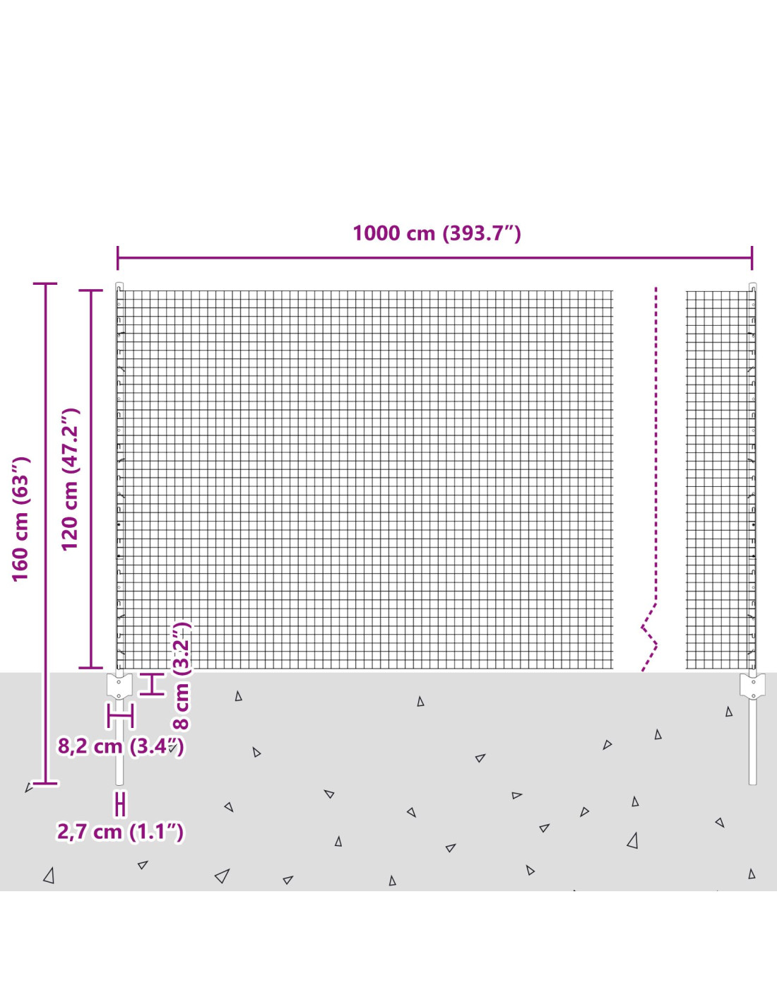 - Dimensioni complessive: 1000 x 2,7 x 120 cm (L x P x A)