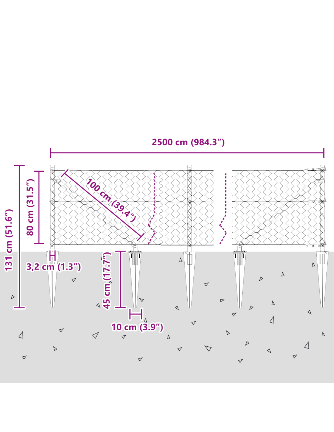 - Dimensioni complessive: 2500 x 3,2 x 80 cm (L x P x A)