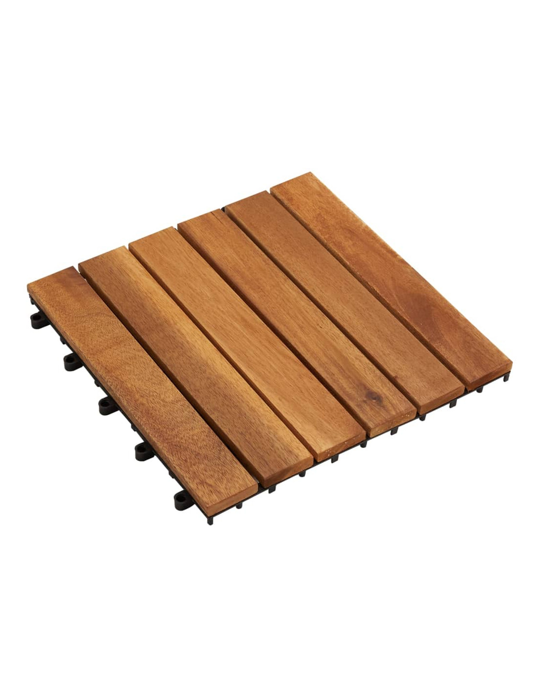 I listelli sono realizzati in legno di alta qualità di acacia, un legno tropicale, resistente agli agenti climatici e molto durevole. Grazie all'attacco ad innesto, le piastrelle possono essere collegate con facilità e strettamente per formare una superficie stabile per camminare.