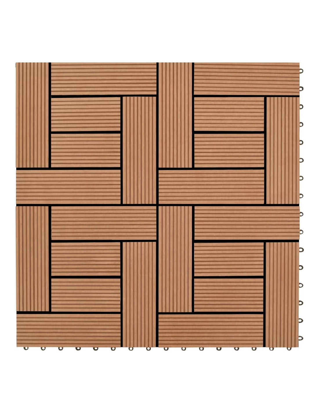 Queste piastrelle in WPC di alta qualità sono caratterizzate da un sistema di interblocco rapido che consente di installarle facilmente e rapidamente senza bisogno di attrezzi. Realizzate in legno composito di plastica di alta qualità, le nostre piastrelle sono impermeabili e molto resistenti.