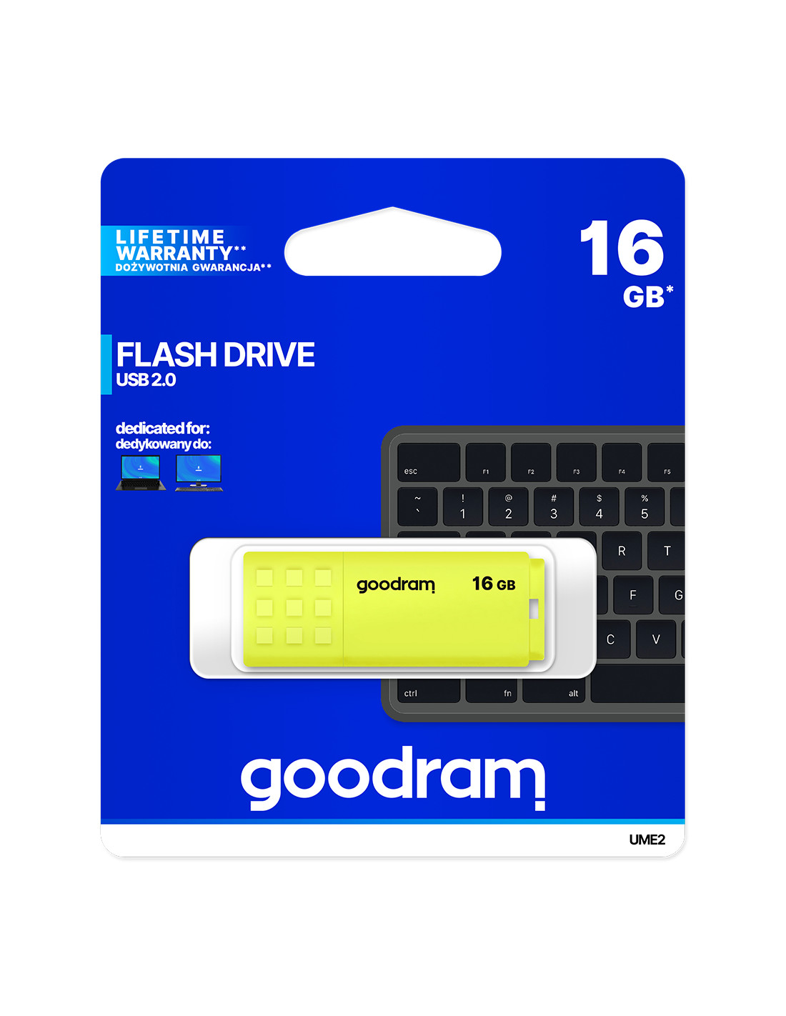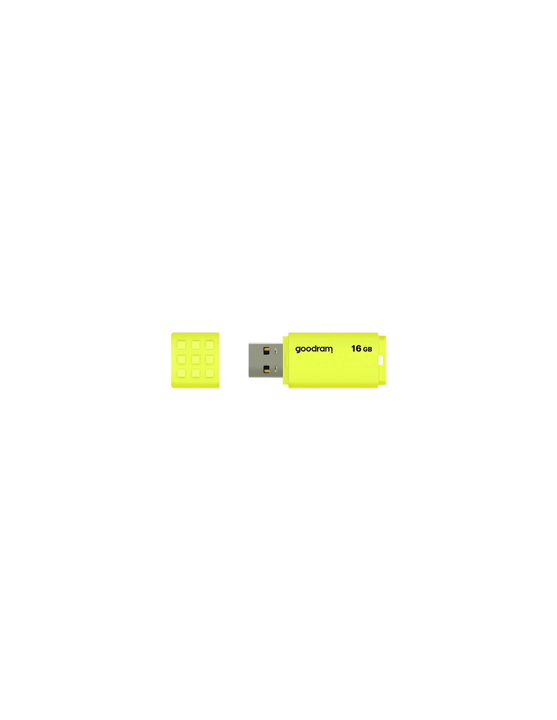 Goodram UME2. Capacità: 16 GB, Interfaccia dispositivo: USB tipo A, Versione USB: 2.0, Velocità di lettura: 20 MB/s, Velocità di scrittura: 5 MB/s. Fattore di forma: Cuffia. Peso: 9 g. Colore del prodotto: Giallo