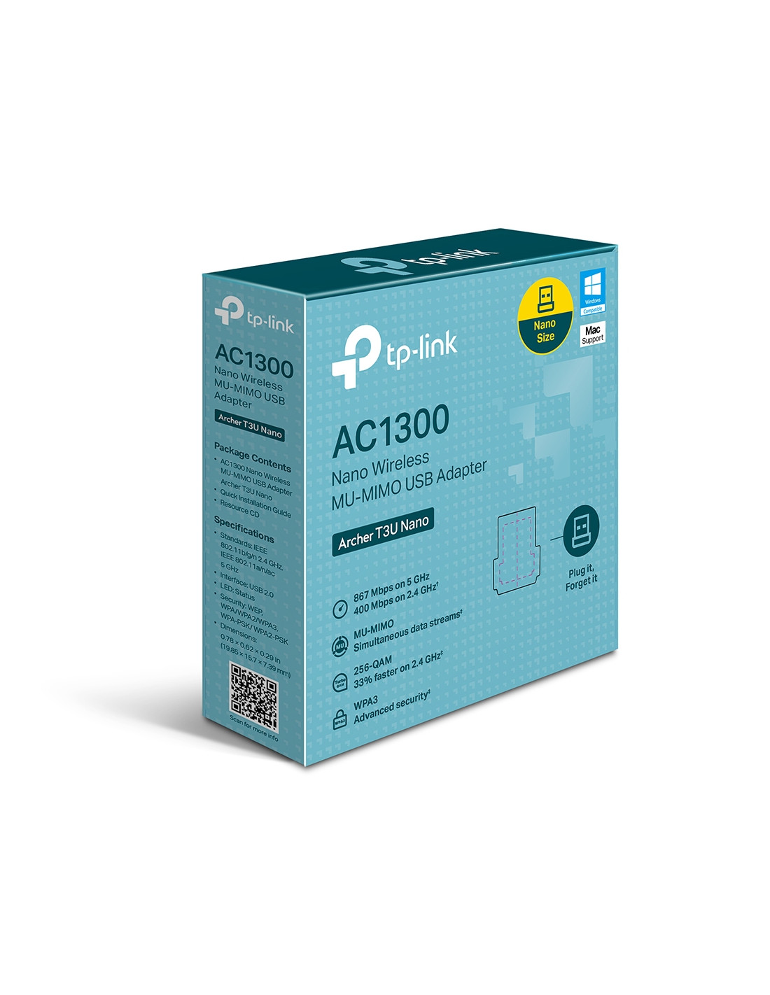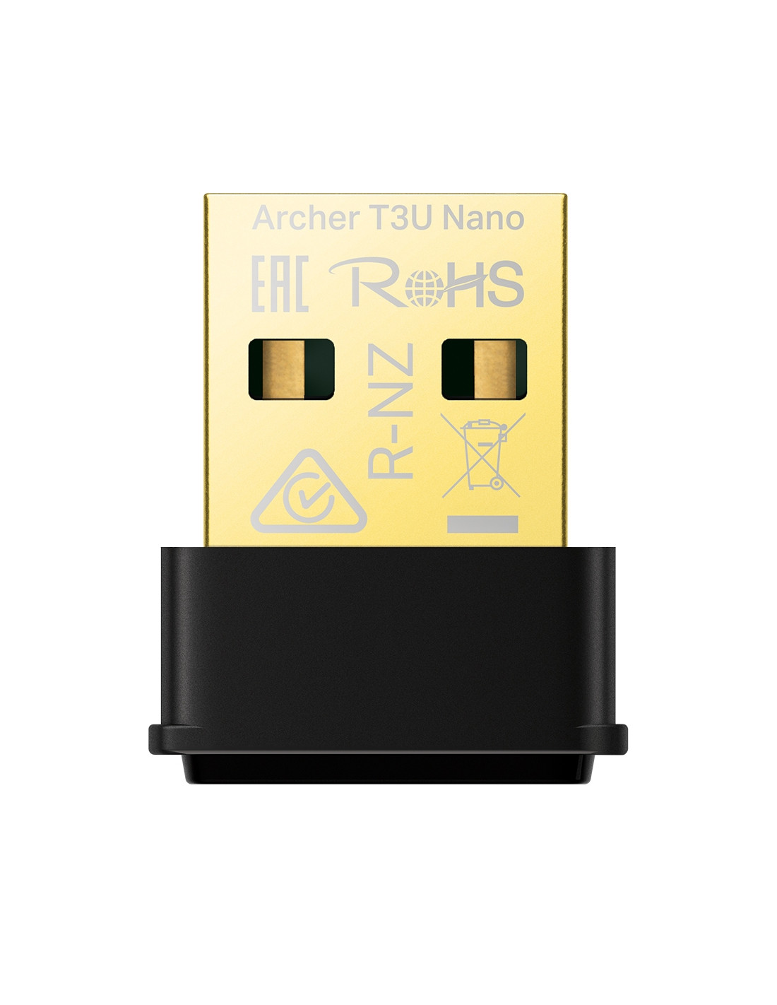TP-Link Archer T3U Nano. Tecnologia di connessione: Wireless, Interfaccia host: USB, Interfaccia: WLAN. Velocità massima di trasferimento dati: 1267 Mbit/s, Wi-Fi standard: Wi-Fi 5 (802.11ac), Banda Wi-Fi: Dual-band (2.4 GHz/5 GHz). Colore del prodotto: Nero