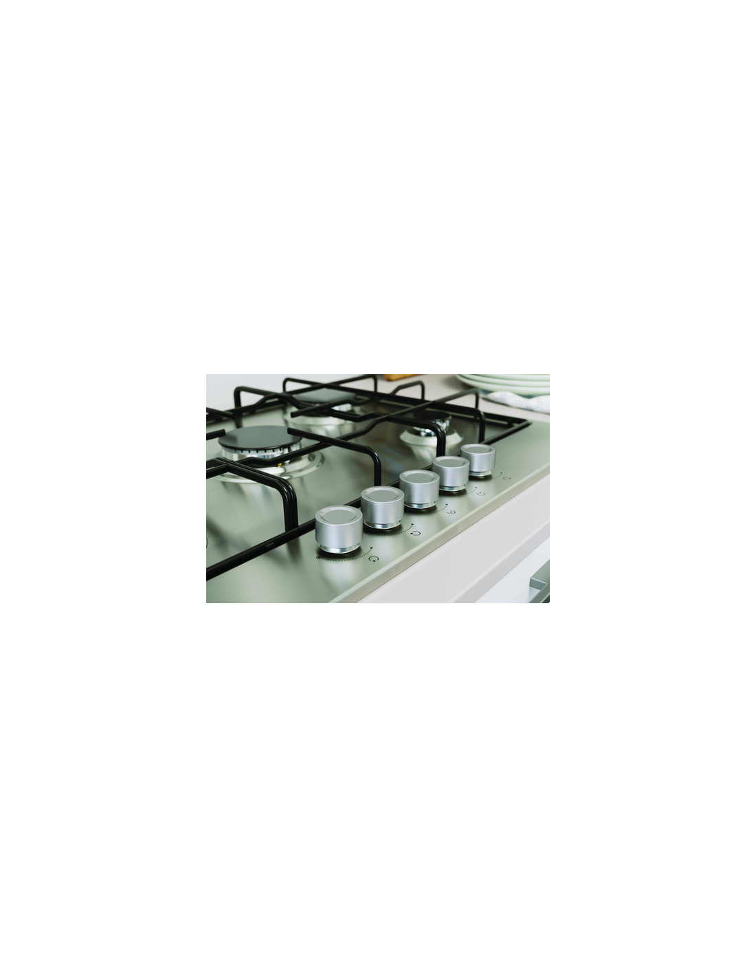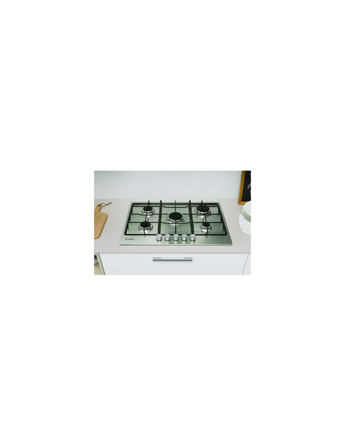 Indesit THP 752 IX/I 1 piano gas inox 75cm 5 fuochi griglie smaltate. Colore del prodotto: Acciaio inox, Posizionamento dell'apparecchio: Da incasso, Dimensione della larghezza del piano cottura: 75 cm. Tipo di controllo: Manopola, Posizione di controllo: Frontale. Potenza aggregata (gas): 10300 W, Tensione di ingresso AC: 220-240 V, Frequenza di ingresso AC: 50/60 Hz. Larghezza: 730 mm, Profondità: 510 mm, Altezza: 58 mm. Larghezza imballo: 800 mm, Profondità imballo: 560 mm, Altezza imballo: 160 mm