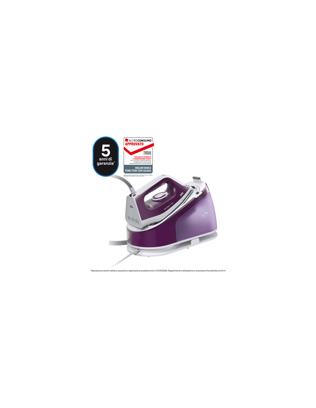 CareStyle 1 Pro, sistema stirante con 5 anni di garanzia*. Potenza 2200W, piastra in superceramica, tecnologia FreeGlide 3D, tanica rimovibile da 1,7L, vapore continuo 120g/min e colpo vapore 400g/min, Pressione 6 bar, sistema di autospegnimento, 3 settaggi della temperatura + temperatura massima, vassoio 2-1 per la pulizia del ferro, sistemo di blocco, impugnatura con grip per aumentare il comfort, colore viola. *estensione aggiuntiva di 3 anni oltre alla garanzia standard. Operazione valida fino al 30.06.2025 Info su www.braunhousehold.com/it-it