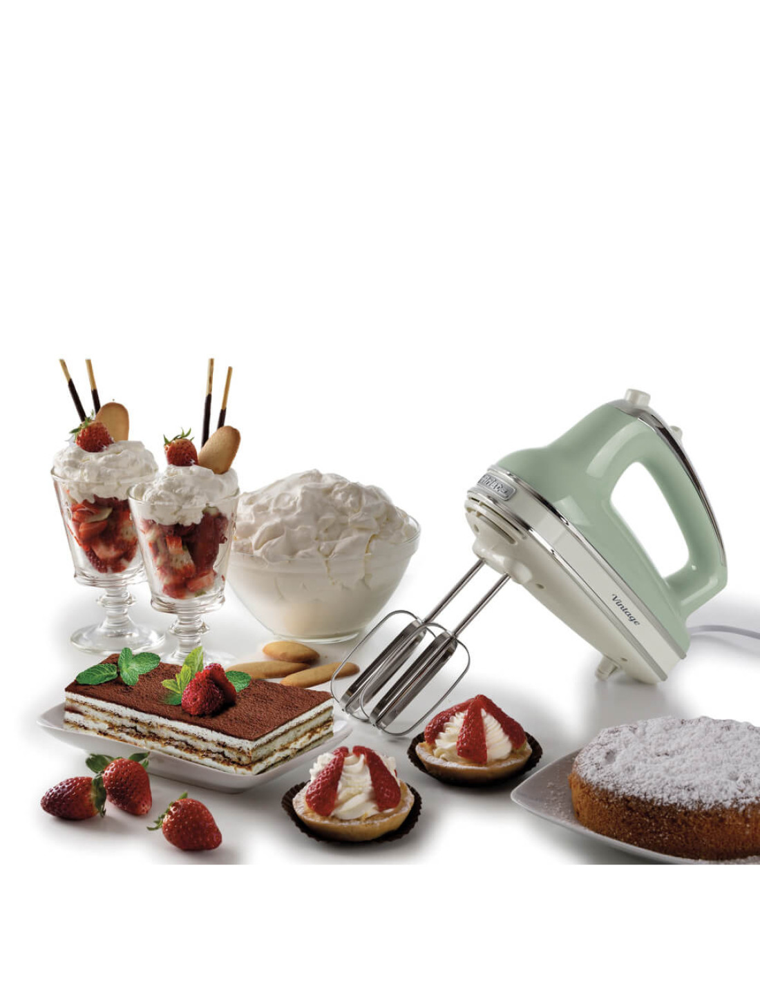 Sbattitore Vintage è lo sbattitore elettrico multifunzione che velocizza i tempi di lavorazione e migliora l'omogeneità degli ingredienti. Grazie alle sue 5 velocità e la funzione Turbo puoi decidere come mixare i tuoi ingredienti e ottenere un composto morbido e facile da lavorare.Il mixer è perfetto per creare in modo semplice e veloce ricette dolci e salate, grazie alle 2 fruste elettriche: una per montare e una per impastare. Potrai preparare impasti per torte, pane, pizza e panna montata. Ideale per lavorare anche gli impasti più duri grazie ai suoi 450W di potenza