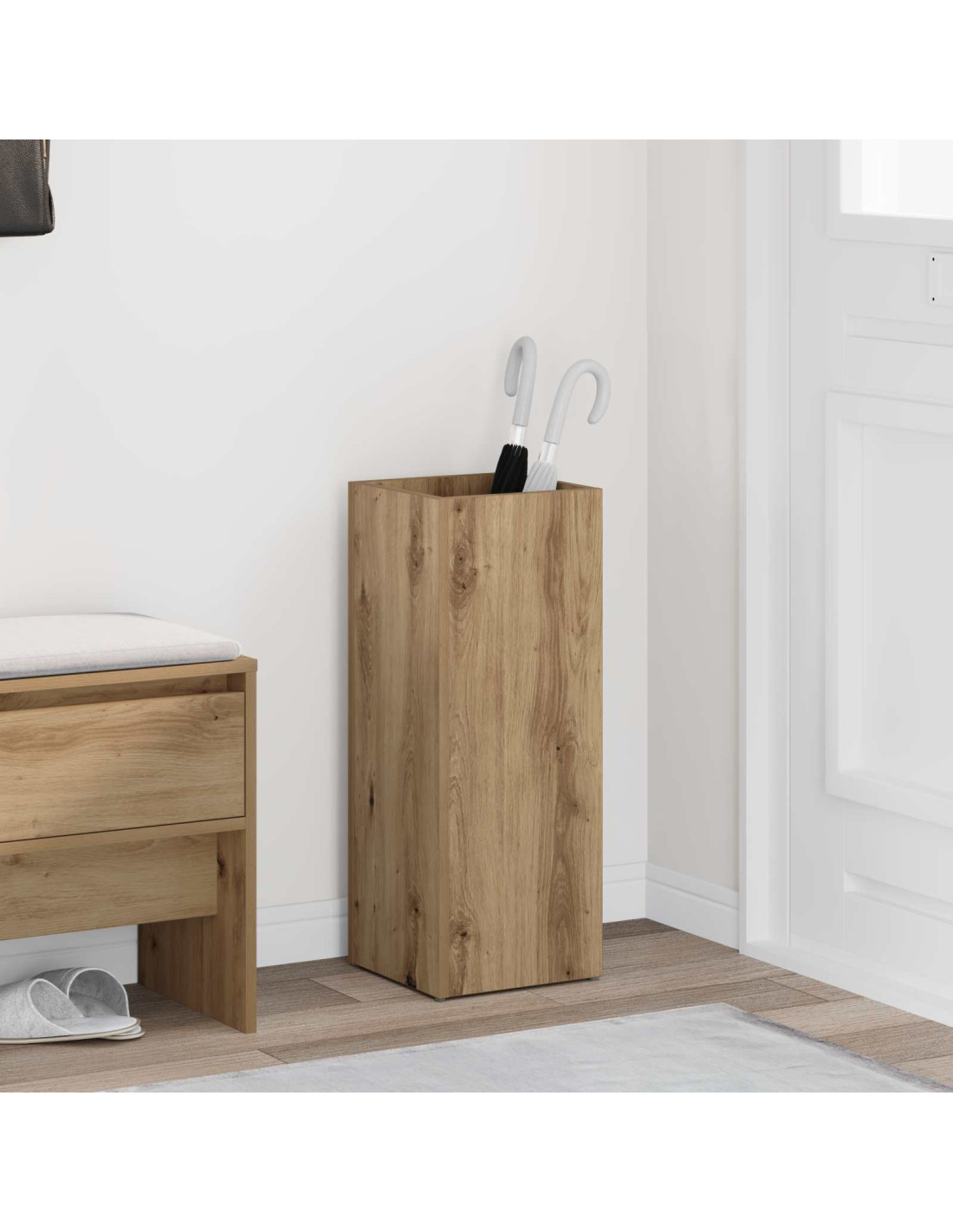 - Struttura in Legno Ingegnerizzato Questo portaombrelli è realizzato in legno ingegnerizzato, per una costruzione robusta che resiste all'uso quotidiano. La solidità del materiale garantisce durata e stabilità, rendendolo perfetto per le famiglie che cercano qualità. La superficie liscia contribuisce all'estetica moderna, abbinandosi perfettamente a case contemporanee.