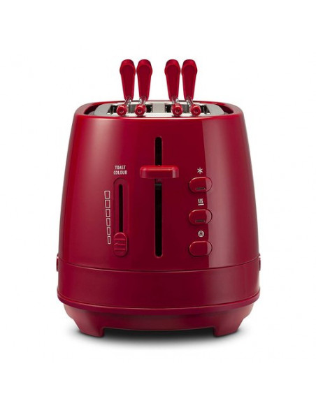 Tostapane 2 fette con pinze, controllo elettronico progressivo del grado di tostatura, funzioni con indicatore luminoso (riscalda, scongela, cancella selezione), cassettino raccogli briciole, potenza 550 W; colore rosso.