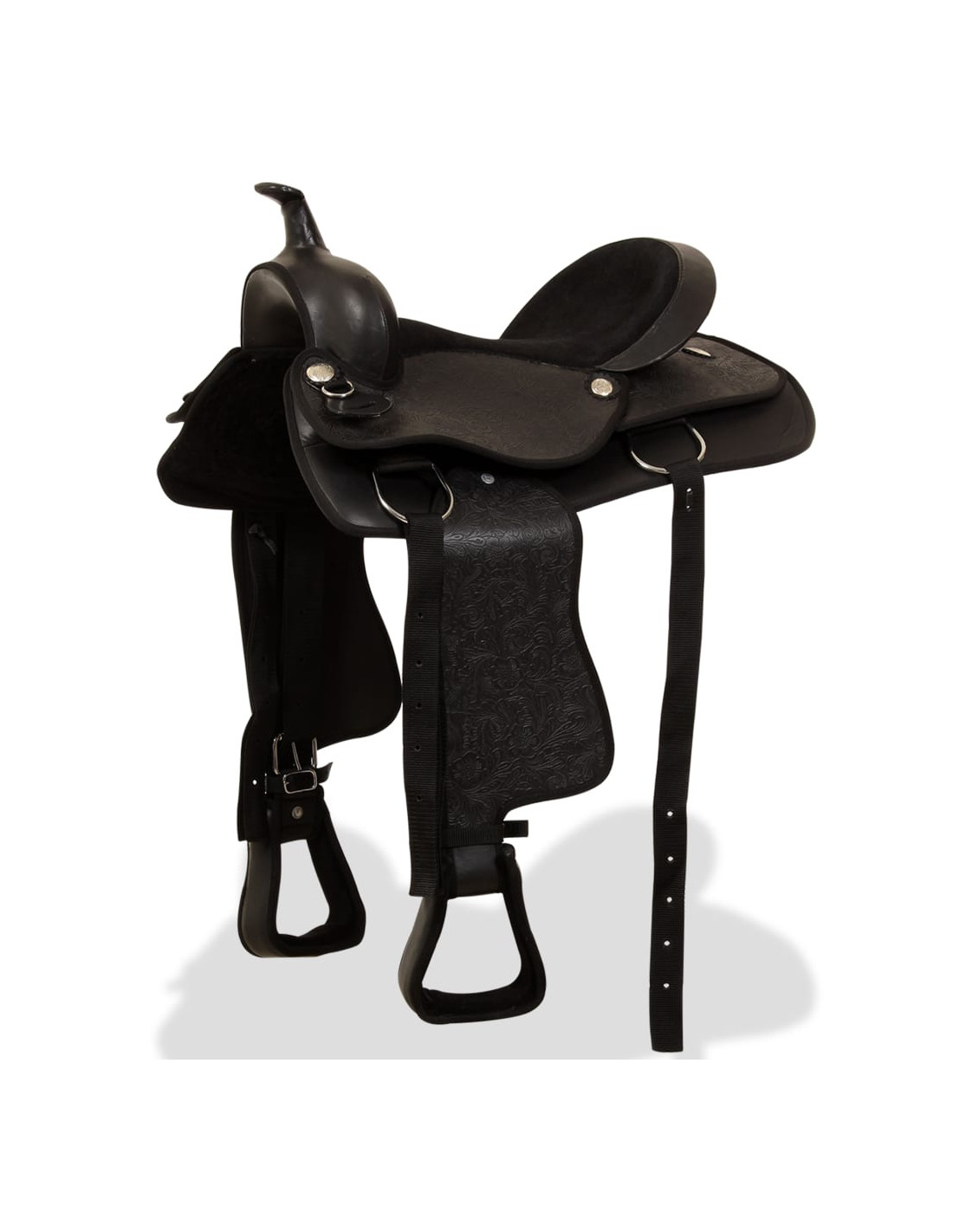 La sella western, realizzata in vera pelle e pelle artificiale di elevata qualità, è decorata con goffrature floreali che le rendono un elemento sia decorativo che funzionale. Questa sella western è rinforzata in tutti i punti di pressione per una maggiore resistenza. Le staffe in pelle, le cinghie del sotto pancia e le cinghie di bilanciamento sono robuste e resistenti. Questa sella western è molto comoda, quindi sia il cavallo che il fantino possono trascorrere lungo tempo in giro per i sentieri.