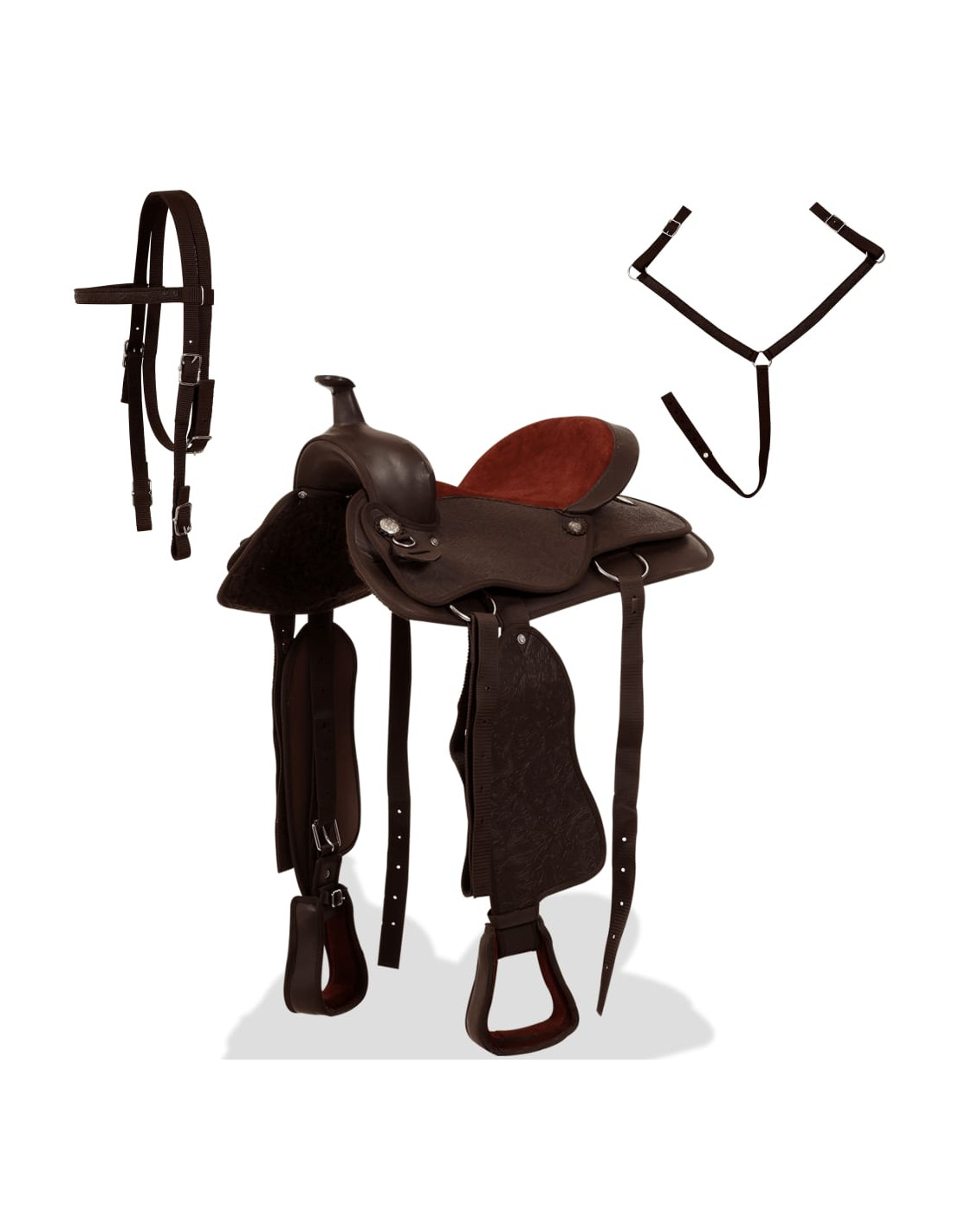 Questa sella western viene consegnata con una testiera ed un pettorale coordinati.
