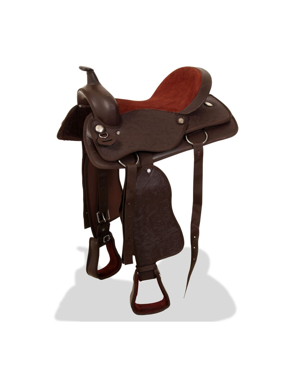 La sella western, realizzata in vera pelle e pelle artificiale di elevata qualità, è decorata con goffrature floreali che le rendono un elemento sia decorativo che funzionale. Questa sella western è rinforzata in tutti i punti di pressione per una maggiore resistenza. Le staffe in pelle, le cinghie del sotto pancia e le cinghie di bilanciamento sono robuste e resistenti. Questa sella western è molto comoda, quindi sia il cavallo che il fantino possono trascorrere lungo tempo in giro per i sentieri.