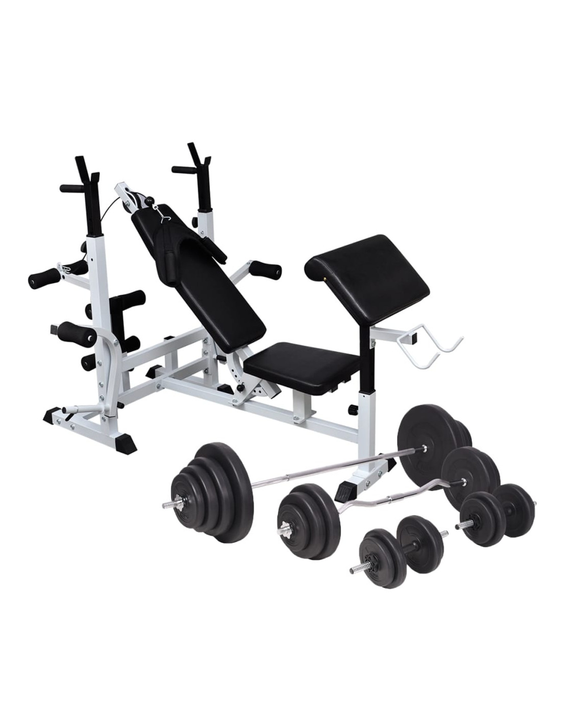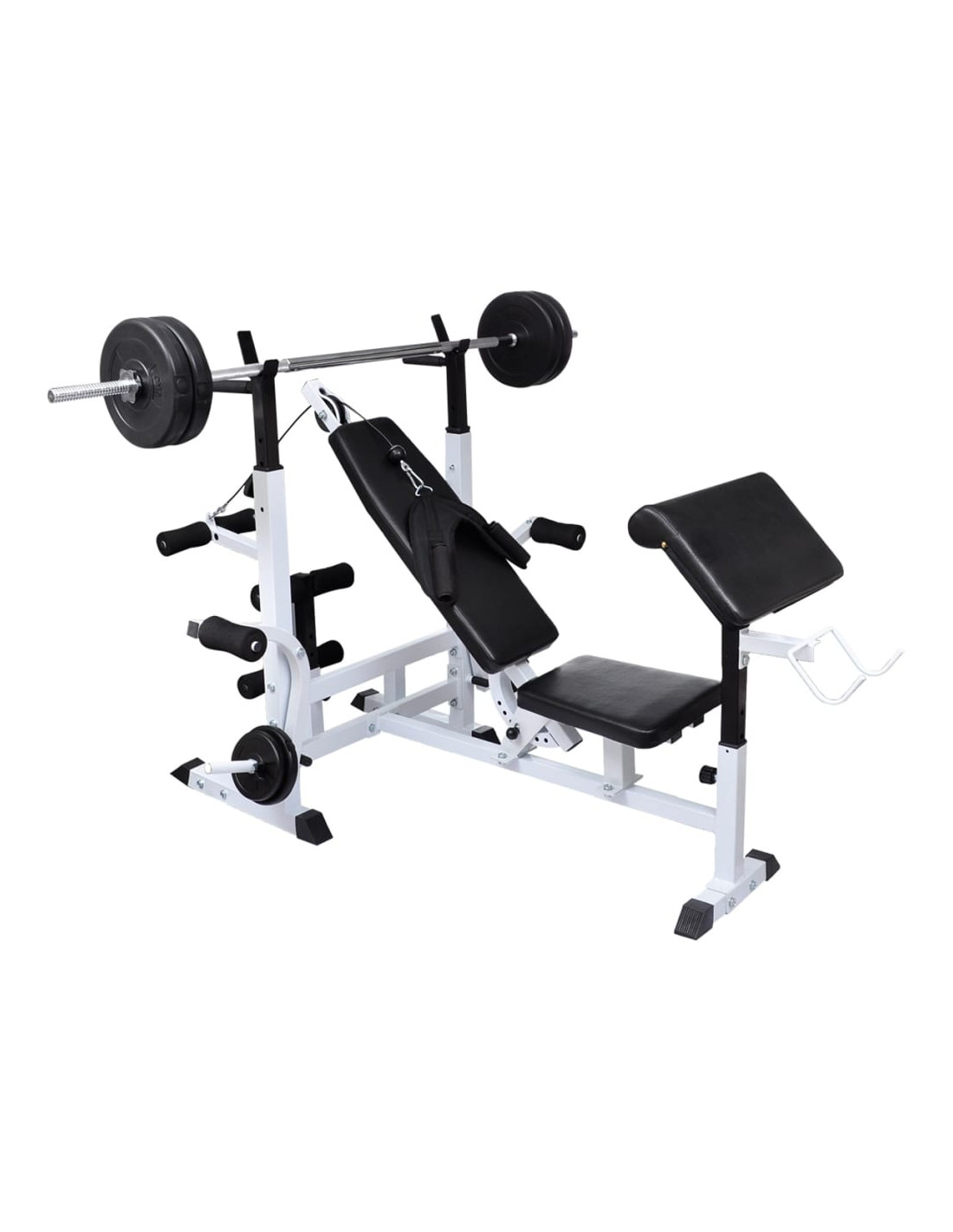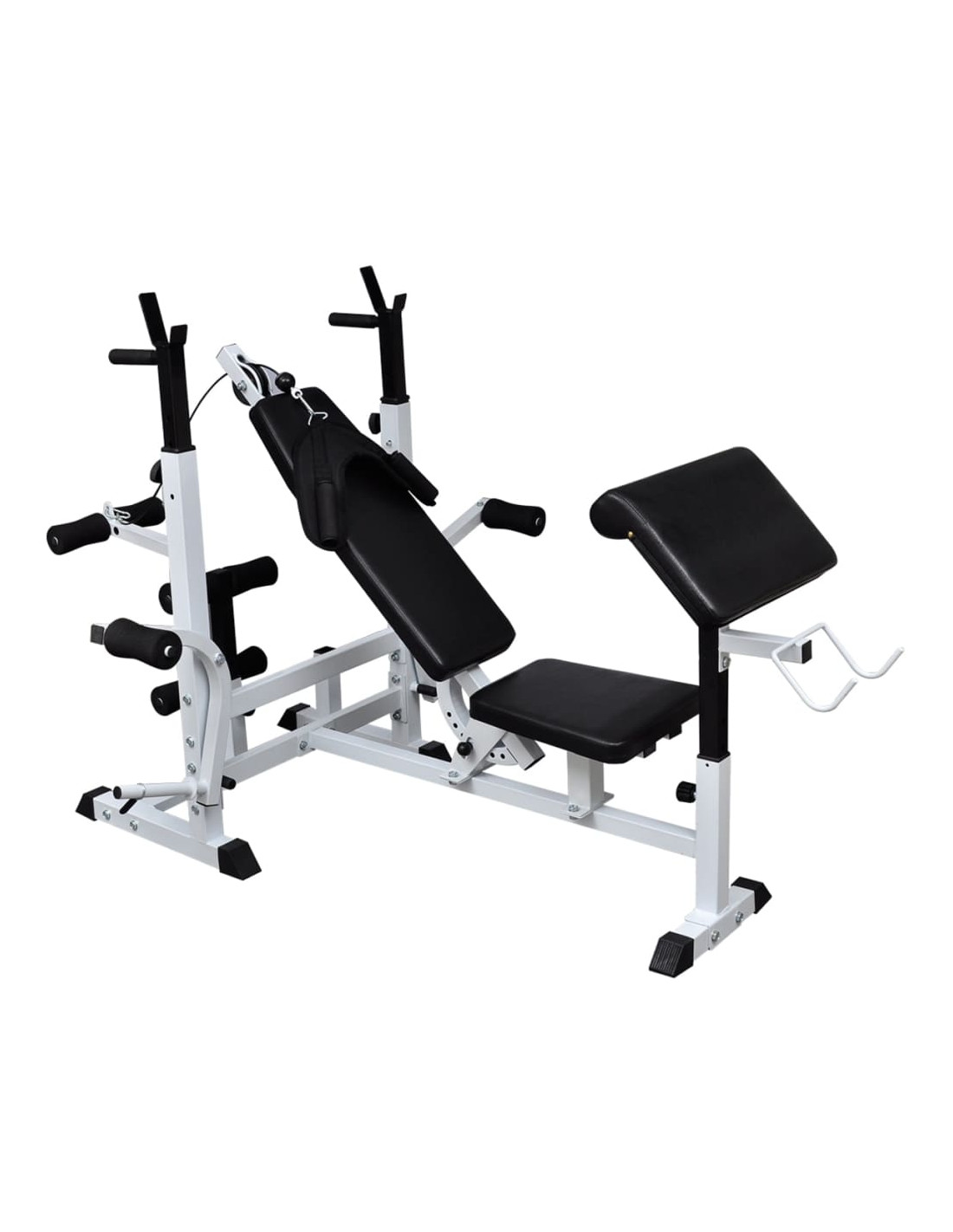 Questa panca multifunzione, con supporto per pesi, bilanciere e set di manubri in dotazione, offre una soluzione ideale per l'allenamento, adatta sia a principianti che ad utenti avanzati. È indicata per sessioni su muscoli specifici o per combinazioni di esercizi che coinvolgono interi gruppi muscolari.