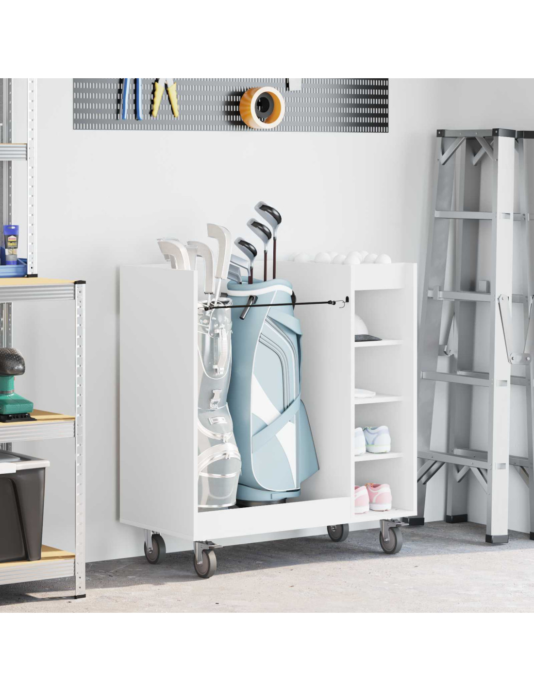 - Usi Consigliati: Ideale per garage o spazi interni che richiedono versatilità. Ottimo per tenere in ordine l’attrezzatura da golf e altro, si integra facilmente in stanze moderne. Non si limita solo allo sport, ma si adatta a diverse esigenze di stoccaggio.