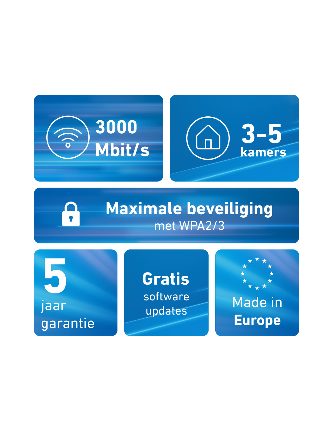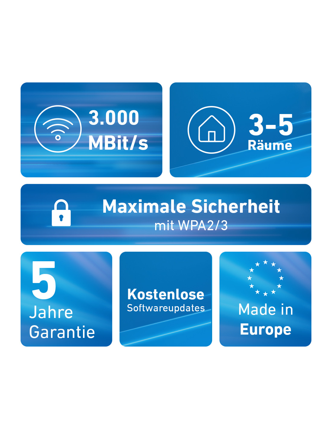 Mesh Set FRITZMESH SET 1600 2-PACK EDITION INTERNATIONAL. Colore del prodotto: Rosso, Bianco, Tipo di antenna: Interno, Tipo di prodotto: Sistema Mesh. Banda Wi-Fi: Dual-band (2.4 GHz/5 GHz), Wi-Fi standard: Wi-Fi 6 (802.11ax), Intervallo di trasferimento dei dati WLAN (max): 3000 Mbit/s. Consumi: 6 W, Tensione di ingresso AC: 230 V, Frequenza di ingresso AC: 50 Hz. Larghezza: 80 mm, Profondità: 37 mm, Altezza: 80 mm. Numero di prodotti inclusi: 2 pz