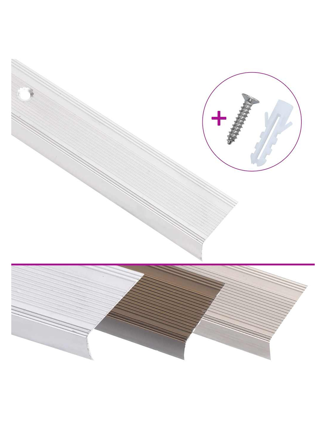 I profili delle scale sono ideali per i luoghi con scale, in particolare le scale a casa. Realizzato in alluminio, ogni paraspigolo a forma di L ha un inserto in plastica antiscivolo ed è molto leggero. Grazie ai fori preesistenti, l'installazione del paraspigoli diventa un gioco da ragazzi e può essere eseguita rapidamente con i tasselli e le viti in dotazione.