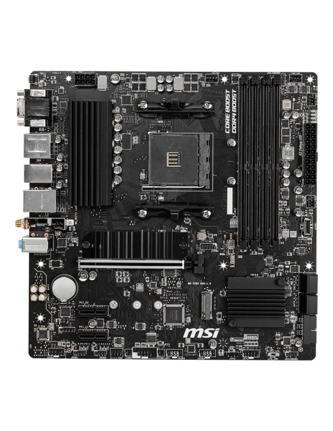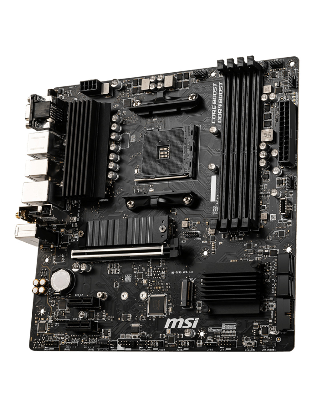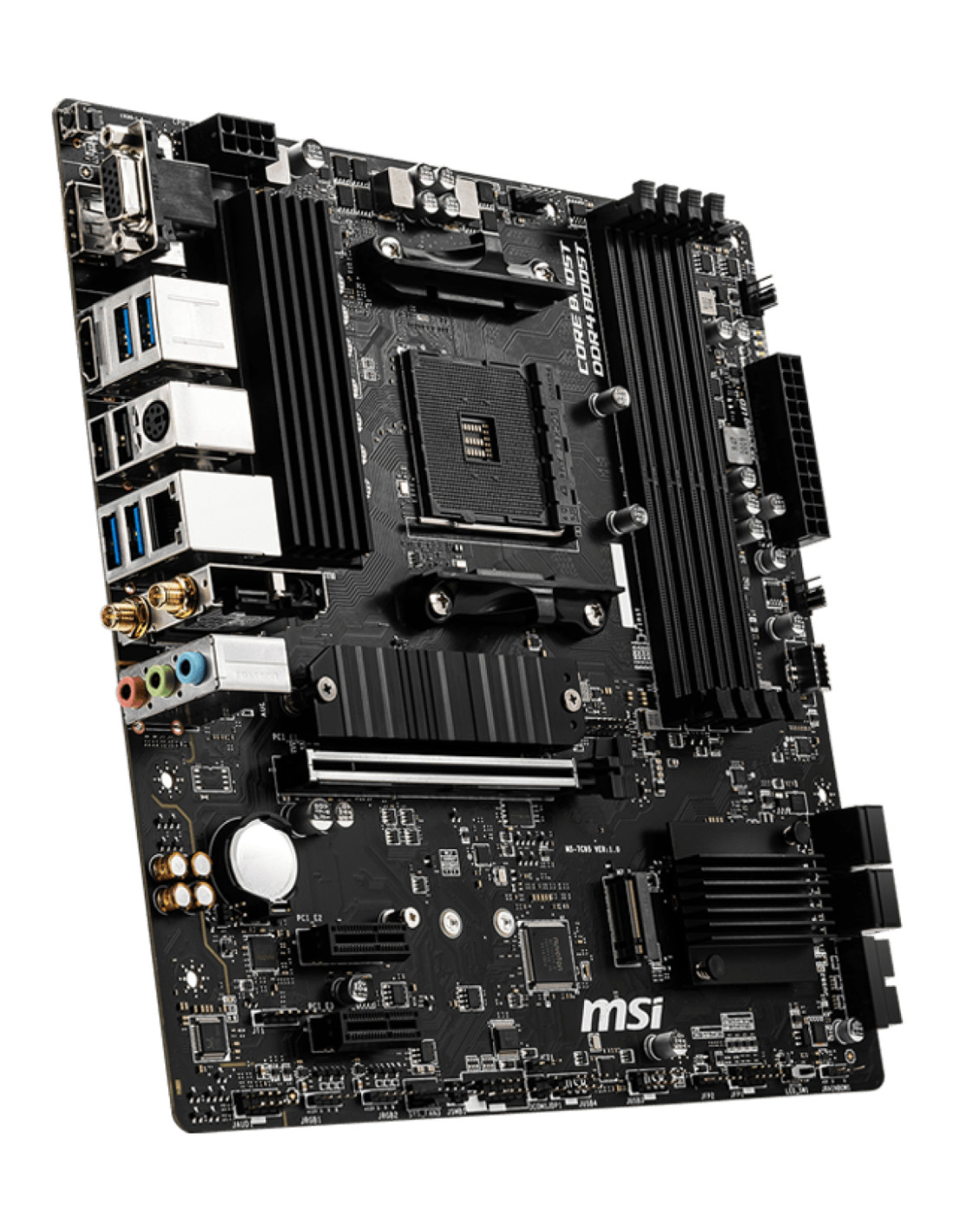 MSI B550M PRO-VDH WIFI. Produttore processore: AMD, Presa per processore: Socket AM4, Processori compatibili: AMD Ryzen 3000 Series. Tipi di memoria supportati: DDR4-SDRAM, RAM massima supportata: 128 GB, tipo di slot di memoria: DIMM. Interfacce dell'unità di archiviazione supportate: SATA III, Tipi di unità di archiviazione supportate: HDD & SSD, Livelli RAID: 0, 1, 10. Memoria massima adattatore grafico: 16000 MB, Risoluzione massima: 4096 x 2160 Pixel. Tipo di interfaccia Ethernet: Gigabit Ethernet, Controller LAN: Realtek 8111HN, Wi-Fi standard: Wi-Fi 5 (802.11ac)