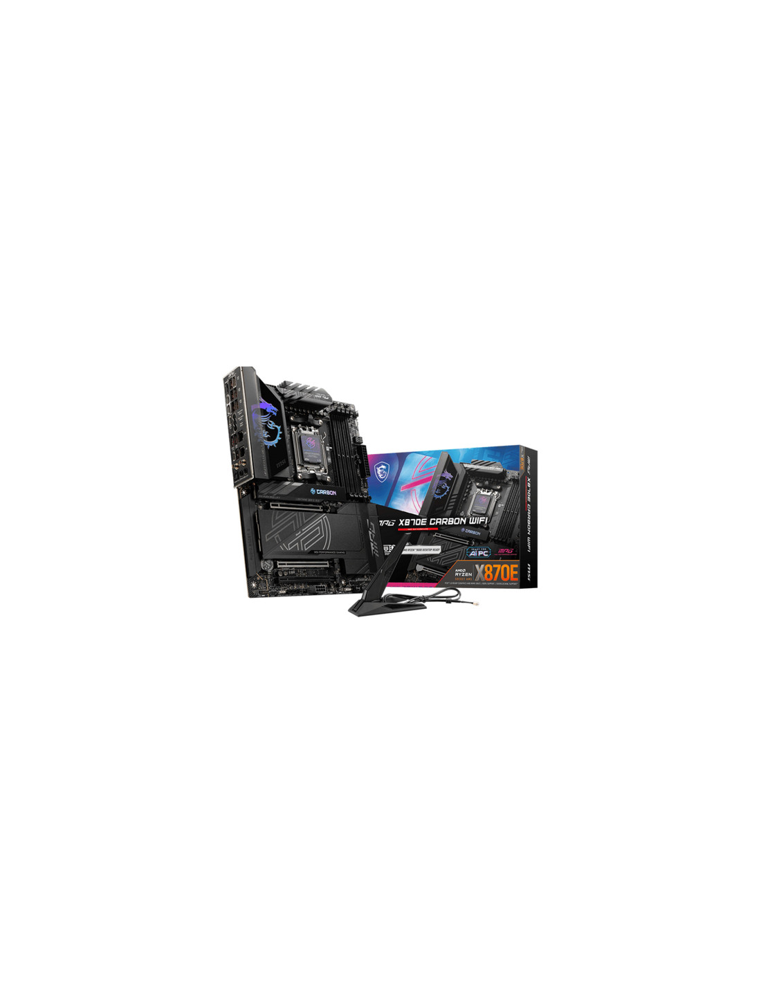 MSI MPG X870E CARBON WIFI. Produttore processore: AMD, Presa per processore: Socket AM5, Processori compatibili: AMD Ryzen™ 7. Tipi di memoria supportati: DDR5-SDRAM, RAM massima supportata: 256 GB, tipo di slot di memoria: DIMM. Interfacce dell'unità di archiviazione supportate: M.2, SATA III, Tipi di unità di archiviazione supportate: HDD & SSD. Tipo di interfaccia Ethernet: 2.5 Gigabit Ethernet, Wi-Fi standard: Wi-Fi 7 (802.11be), Standard Wi-Fi: Wi-Fi 7 (802.11be). Componente per: PC, Fattore di forma scheda madre: ATX, Famiglia di chipset per scheda madre: AMD