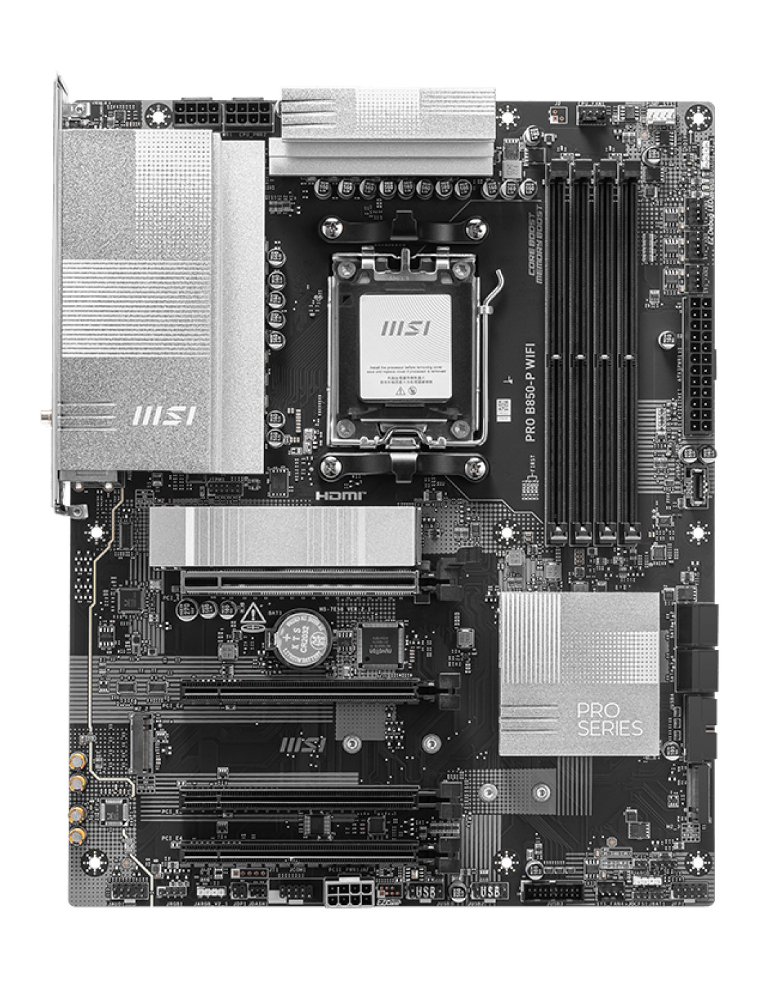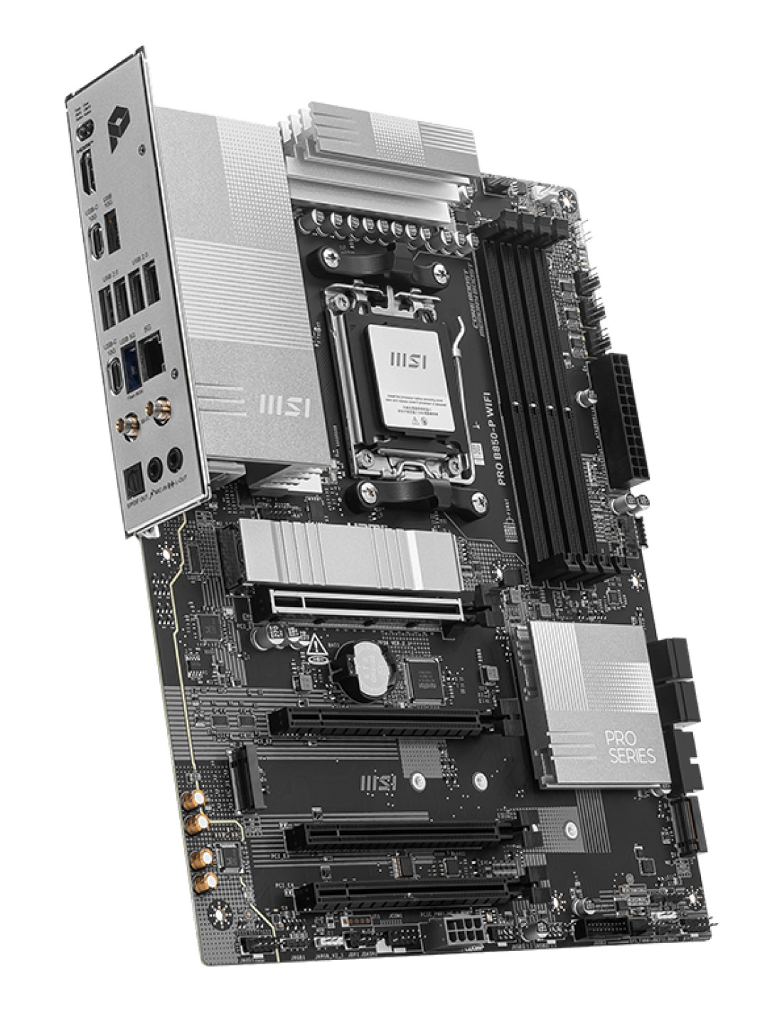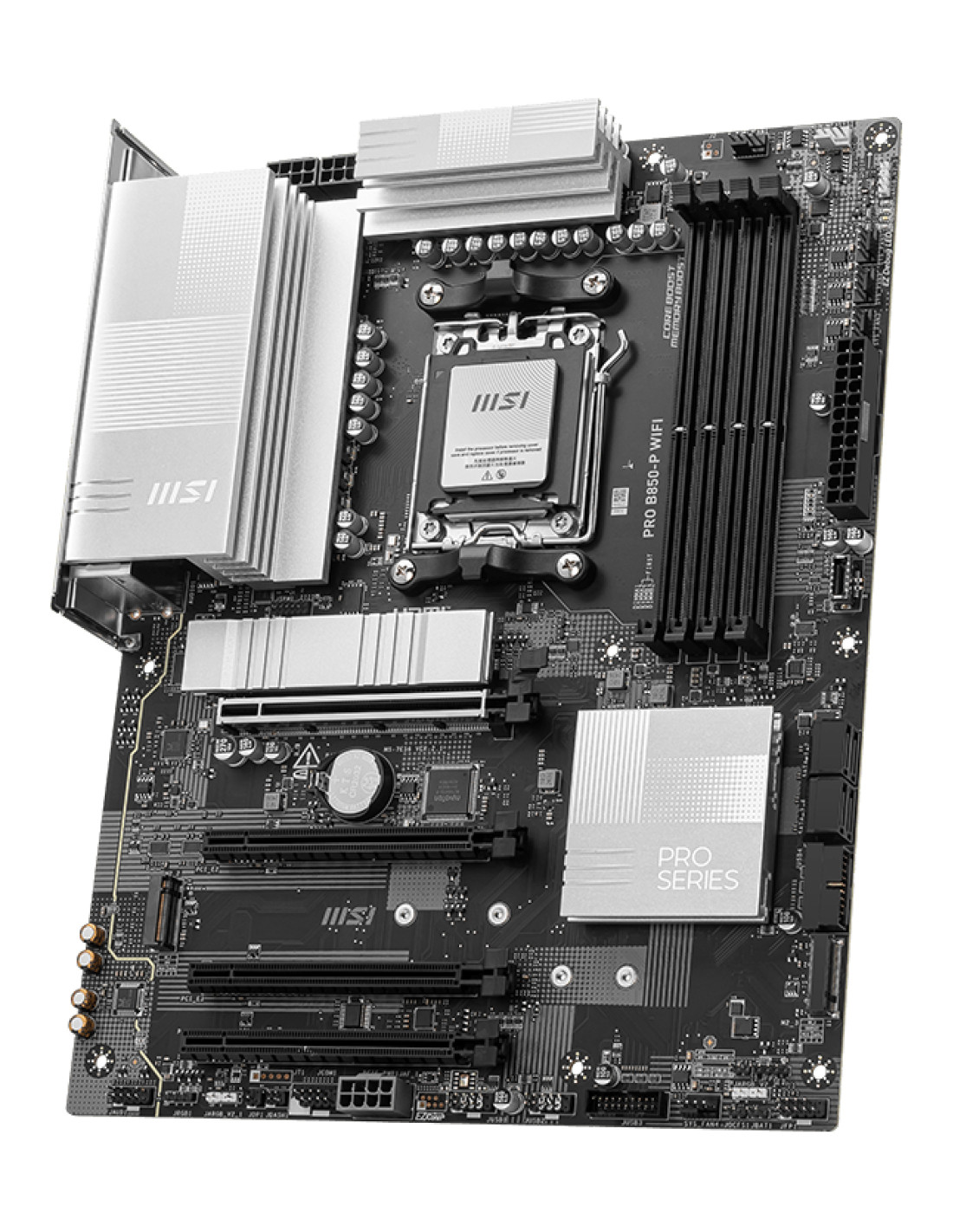 MSI PRO B850-P WIFI. Produttore processore: AMD, Presa per processore: Socket AM5, Processori compatibili: AMD Ryzen 7000 Series, AMD Ryzen 8000 Series, AMD Ryzen 9000 Series. Tipi di memoria supportati: DDR5-SDRAM, RAM massima supportata: 256 GB, tipo di slot di memoria: DIMM. Interfacce dell'unità di archiviazione supportate: M.2, Micro SATA III, Tipi di unità di archiviazione supportate: HDD & SSD, Livelli RAID: 0, 1. Tipo di interfaccia Ethernet: 2.5 Gigabit Ethernet, Wi-Fi standard: Wi-Fi 7 (802.11be), Standard Wi-Fi: 802.11a, 802.11b, 802.11g, Wi-Fi 4 (802.11n), Wi-Fi 5 (802.11ac), Wi-Fi 6 (802.11ax), Wi-Fi 6E.... Componente per: PC, Fattore di forma scheda madre: ATX, Famiglia di chipset per scheda madre: AMD