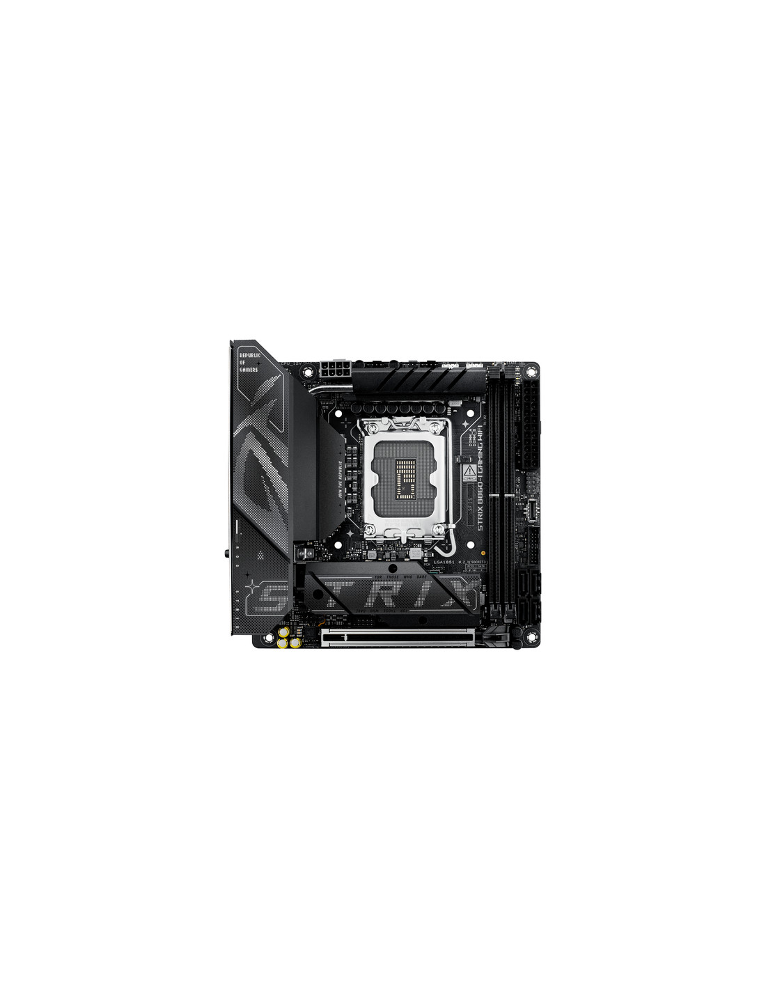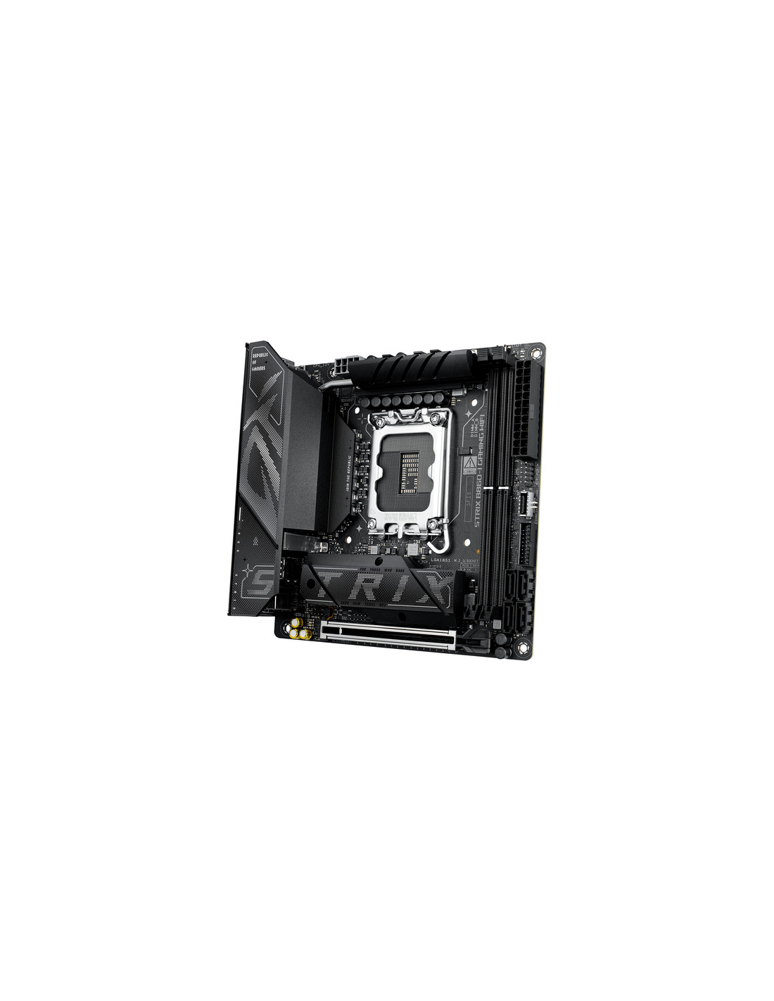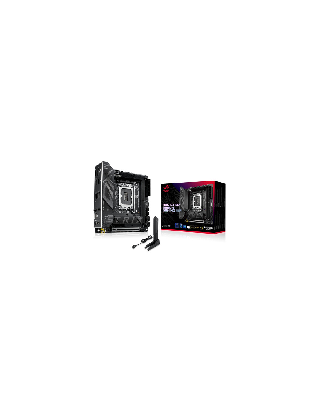 ASUS ROG STRIX B860-I GAMING WIFI. Produttore processore: Intel, Presa per processore: LGA 1851 (Socket V1), Processori compatibili: Intel Core Ultra (Series 2). Tipi di memoria supportati: DDR5-SDRAM, RAM massima supportata: 128 GB, tipo di slot di memoria: DIMM. Interfacce dell'unità di archiviazione supportate: M.2, SATA III, Tipi di unità di archiviazione supportate: HDD & SSD, Livelli RAID: 0, 1, 5, 10. Tipo di interfaccia Ethernet: 2.5 Gigabit Ethernet, Wi-Fi standard: Wi-Fi 7 (802.11be). Componente per: PC, Fattore di forma scheda madre: mini ITX, Famiglia di chipset per scheda madre: Intel