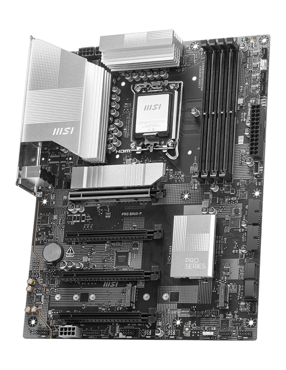 MSI PRO B860-P. Produttore processore: Intel, Presa per processore: LGA 1851 (Socket V1), Processori compatibili: Intel Core Ultra (Series 2). Tipi di memoria supportati: DDR5-SDRAM, RAM massima supportata: 256 GB, tipo di slot di memoria: DIMM. Interfacce dell'unità di archiviazione supportate: M.2, Micro SATA III, Tipi di unità di archiviazione supportate: HDD & SSD, Livelli RAID: 0, 1, 5, 10. Tipo di interfaccia Ethernet: 5 Gigabit Ethernet. Componente per: PC, Fattore di forma scheda madre: ATX, Famiglia di chipset per scheda madre: AMD
