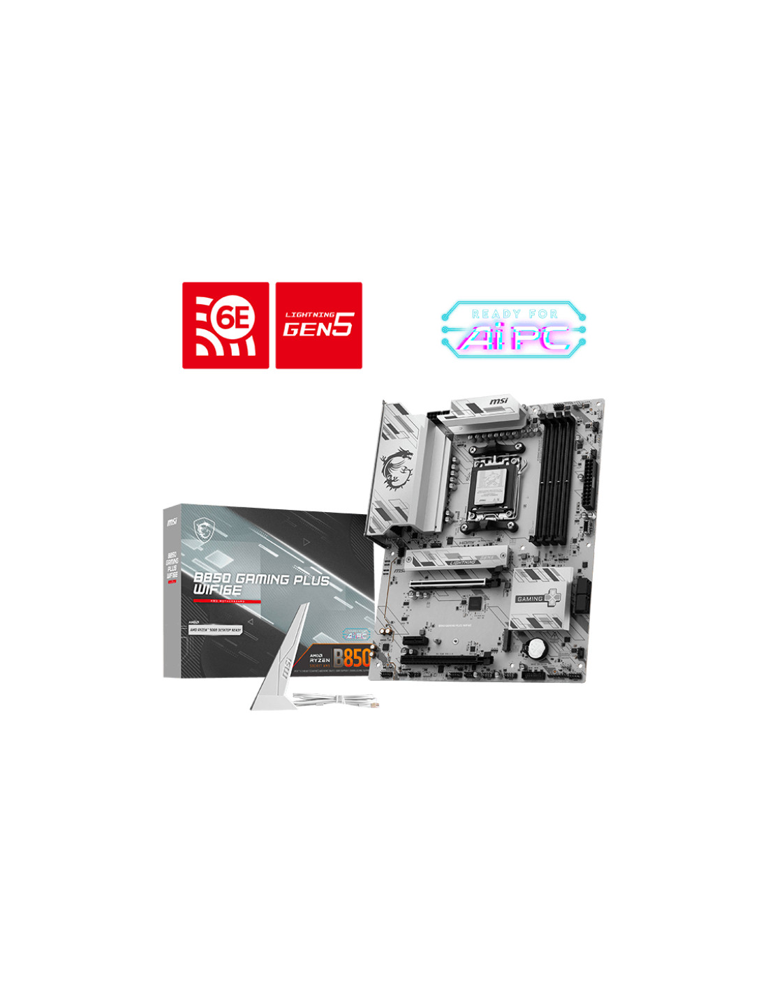 MSI B850 GAMING PLUS WIFI6E. Produttore processore: AMD, Presa per processore: Socket AM5, Processori compatibili: AMD Ryzen 7000 Series, AMD Ryzen 8000 Series, AMD Ryzen 9000 Series. Tipi di memoria supportati: DDR5-SDRAM, RAM massima supportata: 256 GB, tipo di slot di memoria: DIMM. Interfacce dell'unità di archiviazione supportate: M.2, Micro SATA III, Tipi di unità di archiviazione supportate: HDD & SSD, Livelli RAID: 0, 1, 5, 10. Tipo di interfaccia Ethernet: 2.5 Gigabit Ethernet, Controller LAN: Realtek RTL8125D, Wi-Fi standard: Wi-Fi 6E (802.11ax). Componente per: PC, Fattore di forma scheda madre: ATX, Famiglia di chipset per scheda madre: AMD