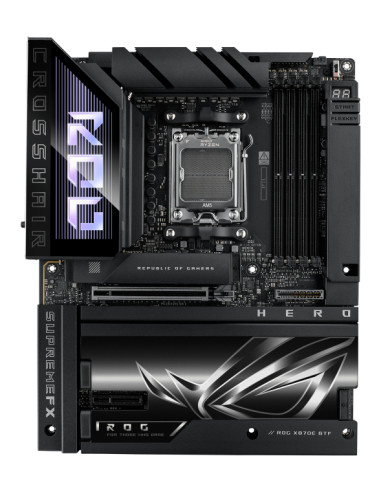 ASUS ROG CROSSHAIR X870E HERO BTF. Produttore processore: AMD, Presa per processore: Socket AM5, Processori compatibili: AMD Ryzen 7000 Series, AMD Ryzen 8000 Series, AMD Ryzen 9000 Series. Tipi di memoria supportati: DDR5-SDRAM, RAM massima supportata: 256 GB, tipo di slot di memoria: DIMM. Interfacce dell'unità di archiviazione supportate: M.2, SATA III, Tipi di unità di archiviazione supportate: HDD & SSD, Livelli RAID: 0, 1, 5, 10. Tipo di interfaccia Ethernet: 2.5 Gigabit Ethernet, 5 Gigabit Ethernet, Wi-Fi standard: Wi-Fi 7 (802.11be). Componente per: PC, Fattore di forma scheda madre: ATX, Famiglia di chipset per scheda madre: AMD