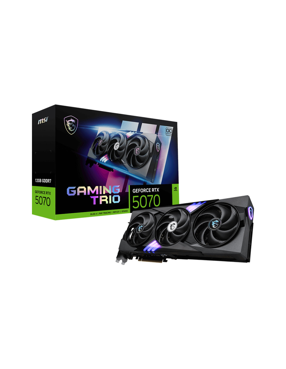 MSI GAMING GeForce RTX 5070 12G TRIO OC. Processore grafico / fornitore: NVIDIA, Processore grafico: GeForce RTX 5070. Memoria Grafica Dedicata: 12 GB, Tipo memoria adattatore grafico: GDDR7, Ampiezza dati: 192 bit. Risoluzione massima: 7680 x 4320 Pixel. Versione DirectX: 12 Ultimate, Versione OpenGL: 4.6. Tipo interfaccia: PCI Express 5.0. Tipo di raffreddamento: Attivo, Numero di ventole: 3 ventola(e)
