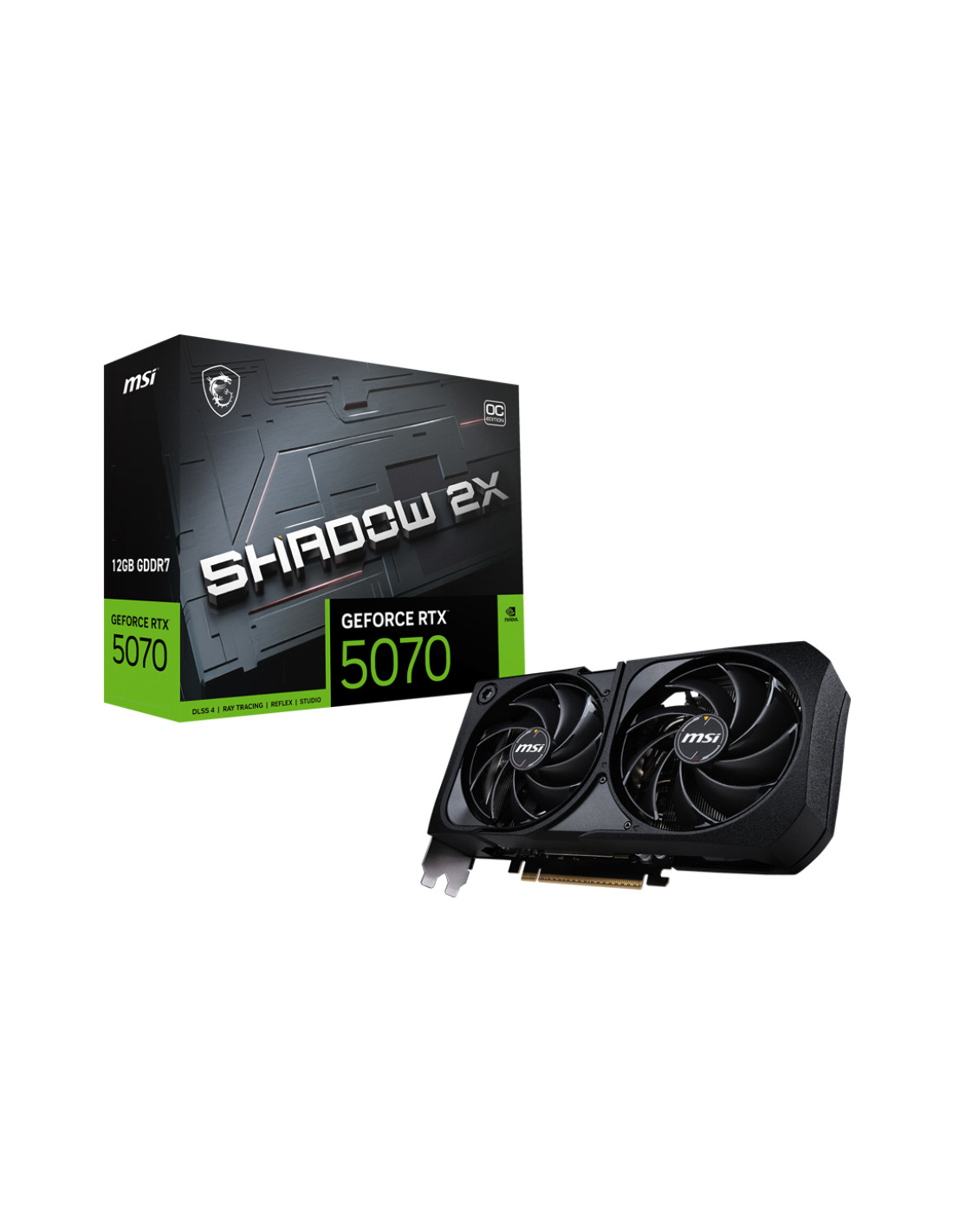MSI GeForce RTX 5070 12G SHADOW 2X OC. Processore grafico / fornitore: NVIDIA, Processore grafico: GeForce RTX 5070. Memoria Grafica Dedicata: 12 GB, Tipo memoria adattatore grafico: GDDR7, Ampiezza dati: 192 bit. Risoluzione massima: 7680 x 4320 Pixel. Versione DirectX: 12 Ultimate, Versione OpenGL: 4.6. Tipo interfaccia: PCI Express x16 5.0. Tipo di raffreddamento: Attivo, Numero di ventole: 2 ventola(e)