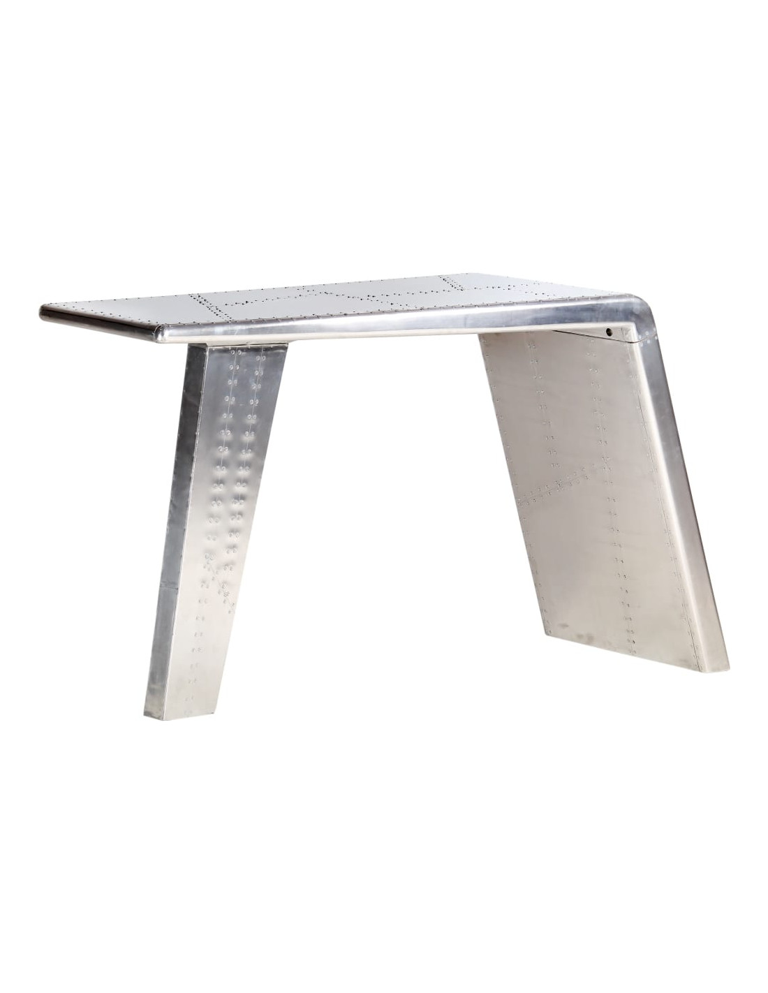 La scrivania in stile aeronautico è realizzata in legno lavorato e la sua superficie è rivestita con patchwork di pannelli in metallo lucidato con viti in acciaio a vista, che la rendono estremamente resistente. È inoltre dotata di un ampio piano d'appoggio che offre ampio spazio per il posizionamento di fascicoli, documenti, libri o altri oggetti. La scrivania è facile da montare.