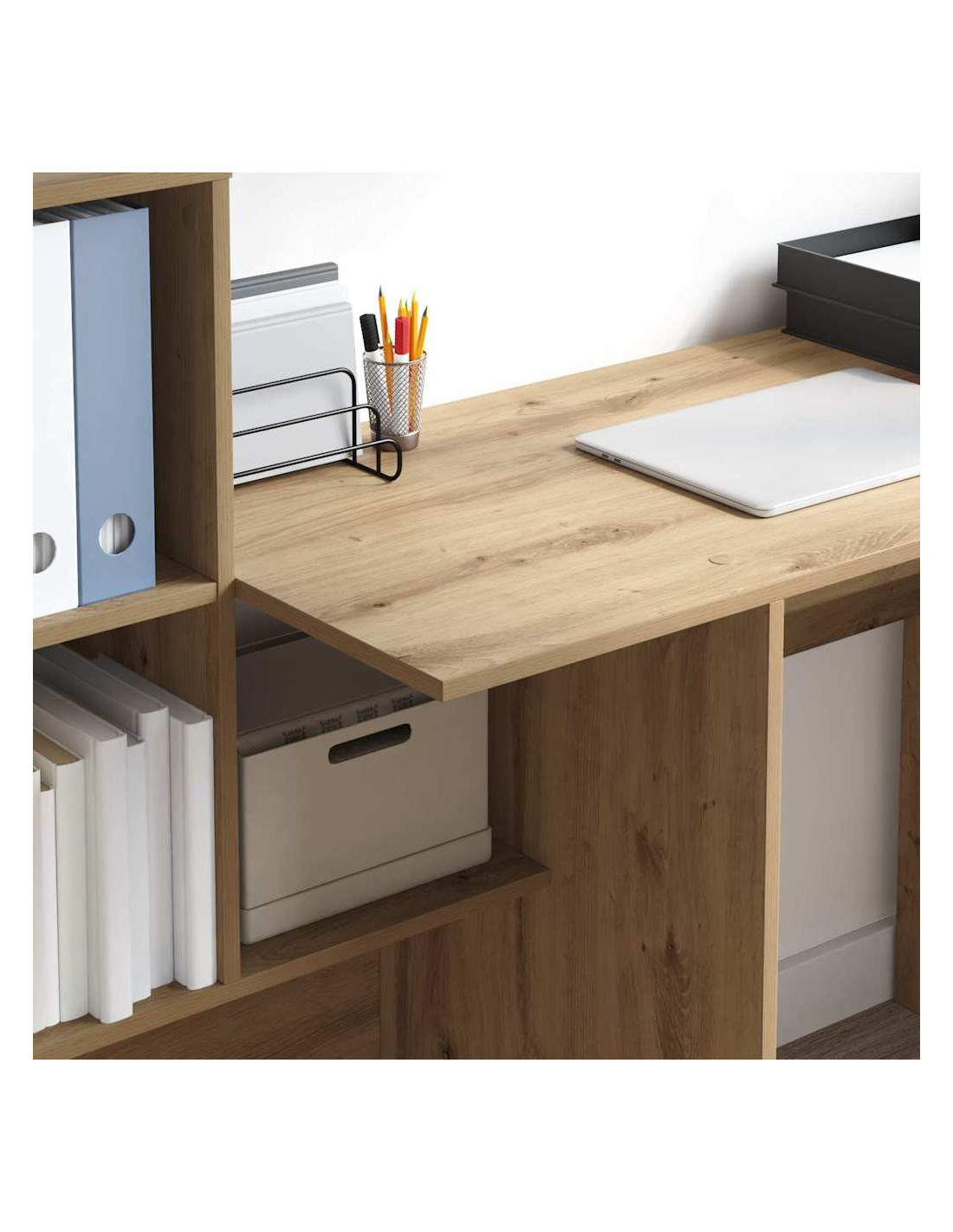 - Mensole Integrate: Con pratiche mensole, questa scrivania offre tantissimo spazio per libri, documenti e materiali per l'ufficio. Queste mensole aiutano a mantenere l'area di lavoro ordinata, aumentando la produttività.