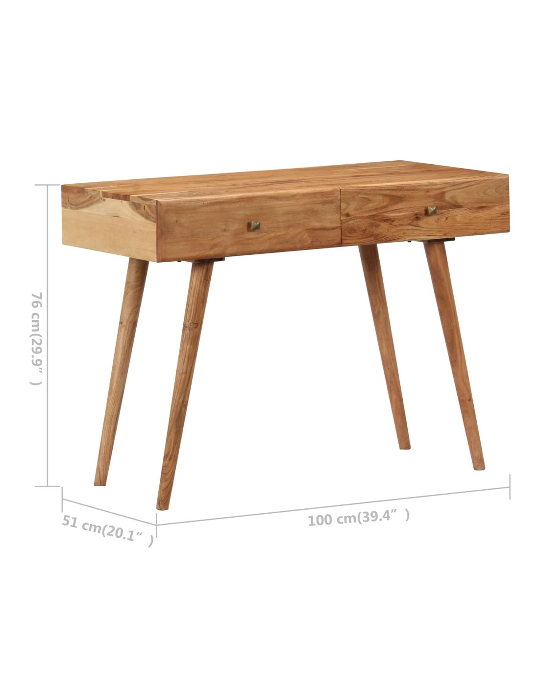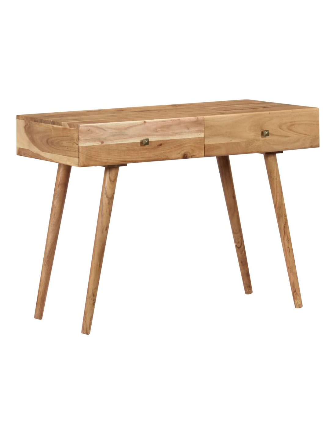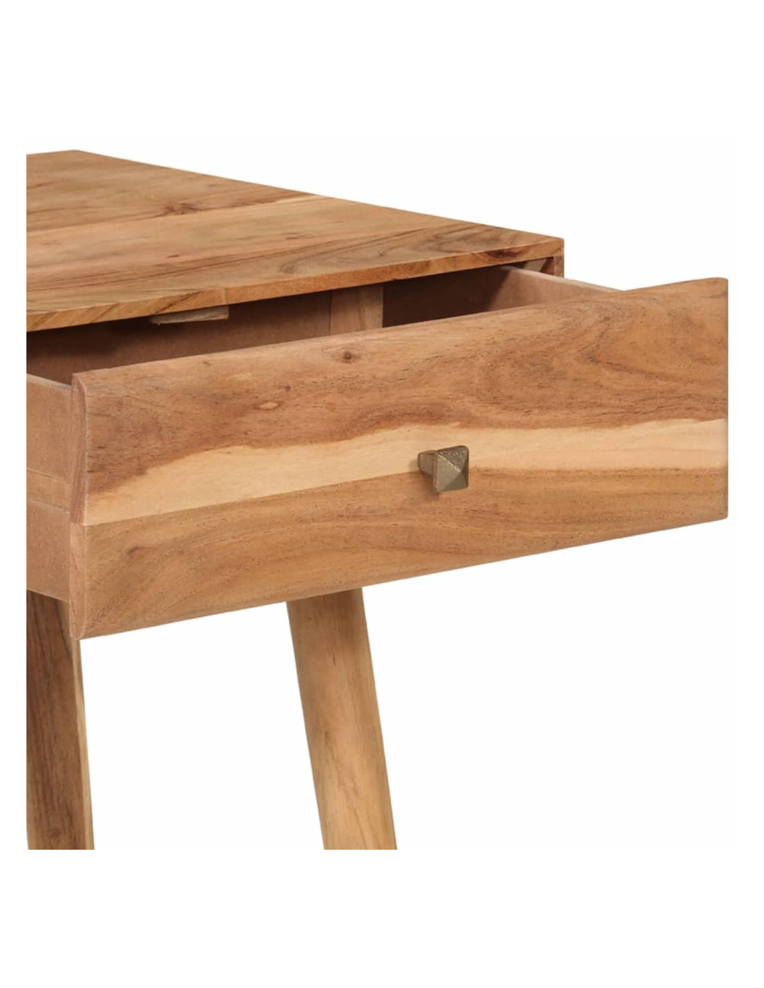 Lo scrittoio è realizzato in legno massello di acacia a cui è stata applicata una finitura color miele che conferisce al prodotto un bell'aspetto e un colore caldo. L'artigianalità e le eleganti venature del legno rendono ogni pezzo unico e leggermente diverso da tutti gli altri. Questa robusta scrivania è dotata di 2 cassetti che offrono ampio spazio per tenere in ordine quaderni, libri e vari altri oggetti. Questo mobile può essere utilizzato, oltre che come tavolo per computer, anche come tavolo consolle, tavolo da ingresso o tavolino laterale.