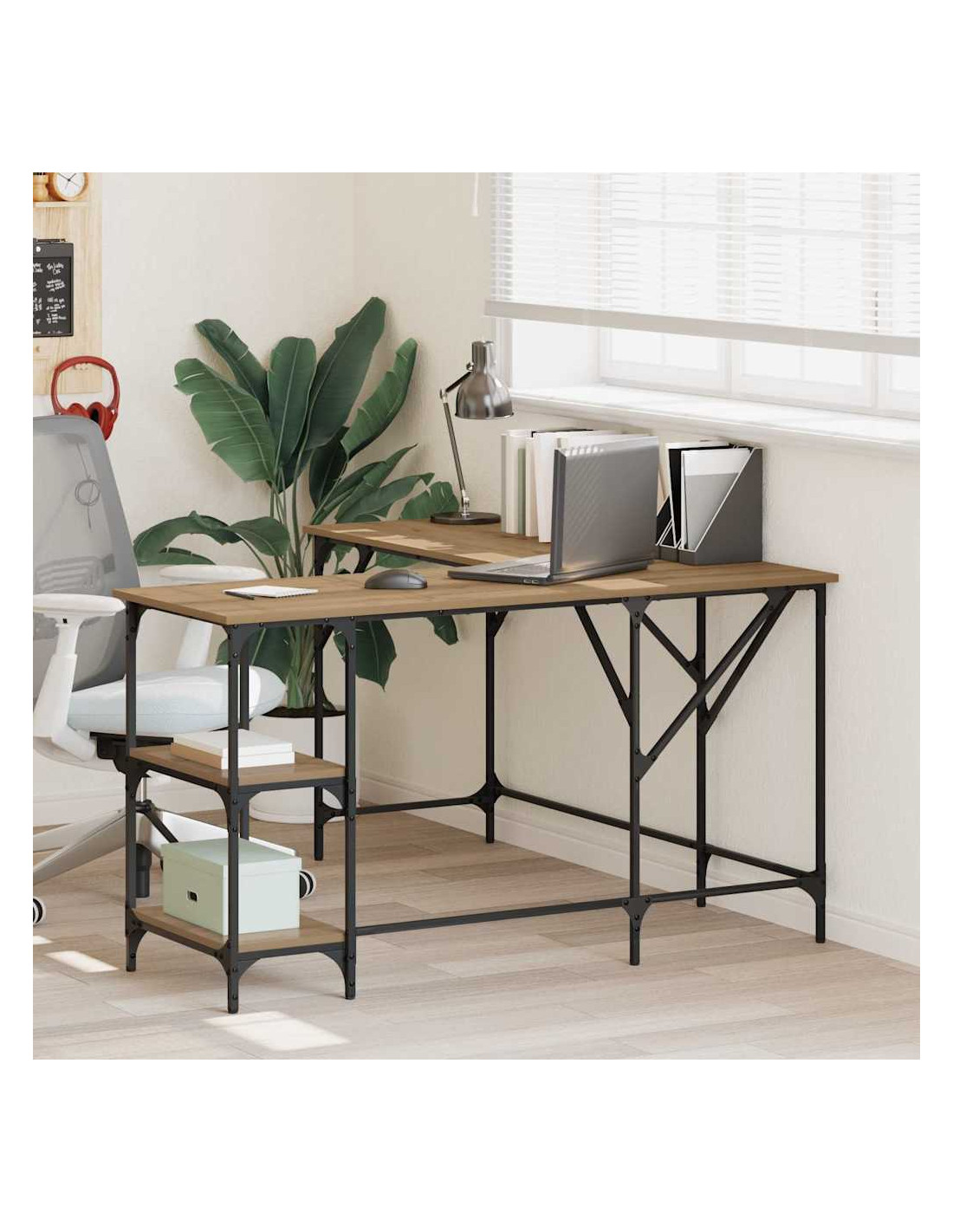 Questa scrivania L combina stile e funzionalità, ispirata all'estetica dei loft urbani. È fatta di legno ingegnerizzato e ha gambe in acciaio, offrendo un mix di bellezza e praticità. Perfetta per chi cerca uno spazio di lavoro ampio e versatile, è ideale per uffici domestici, aree studio o studi creativi. La combinazione di materiali grezzi le dà un aspetto chic e utile, che si integra bene con la maggior parte degli interni.