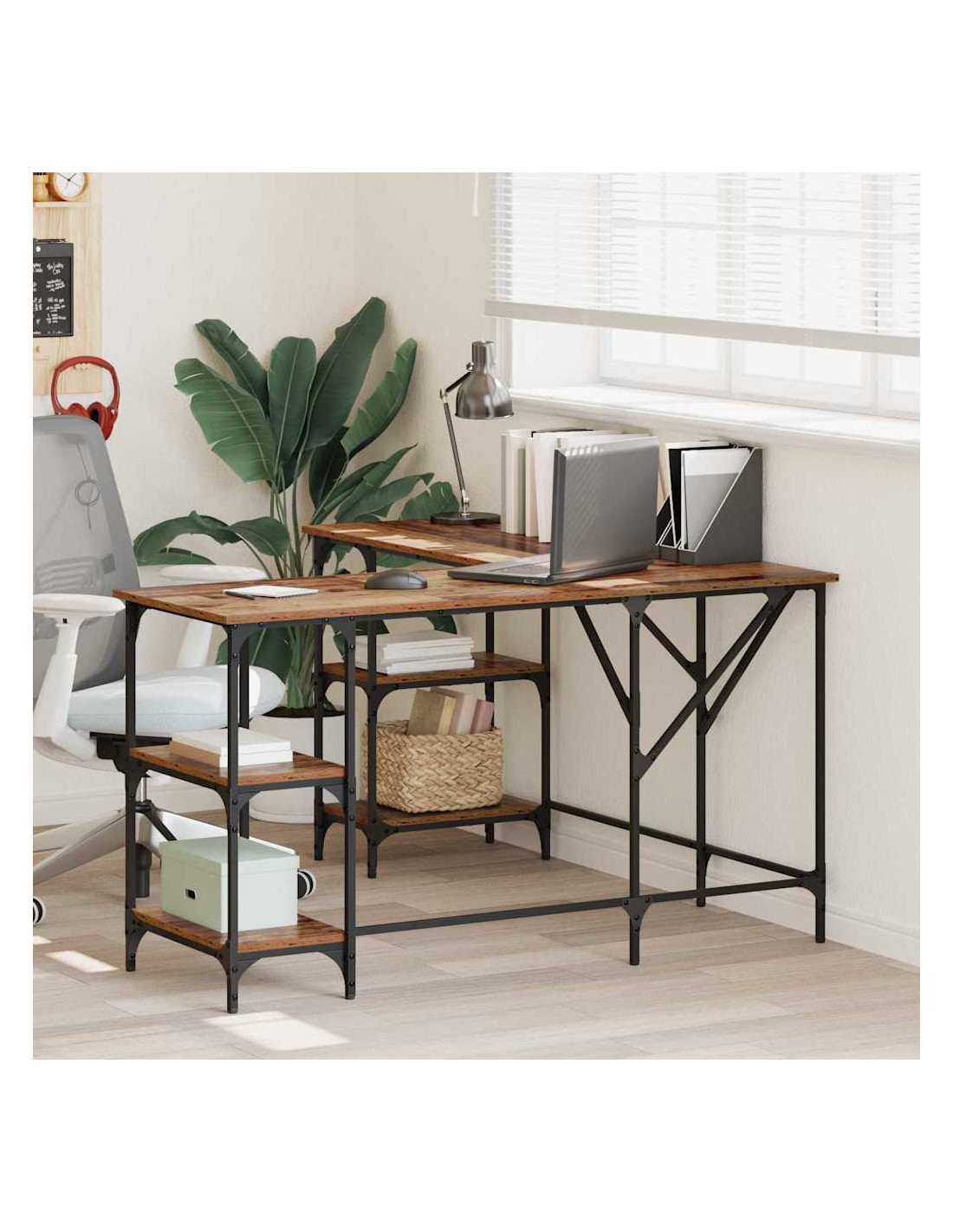 Questa scrivania ad angolo L con scaffali è ideale per qualsiasi studio o ufficio. Ha un design industriale che mescola materiali grezzi e uno stile moderno. Si adatta perfettamente agli angoli e massimizza lo spazio, ideale per più monitor o postazioni di lavoro. La superficie ruvida e la finitura invecchiata richiamano il fascino dei mobili vintage, offrendo tanto spazio per le tue attività d'ufficio.