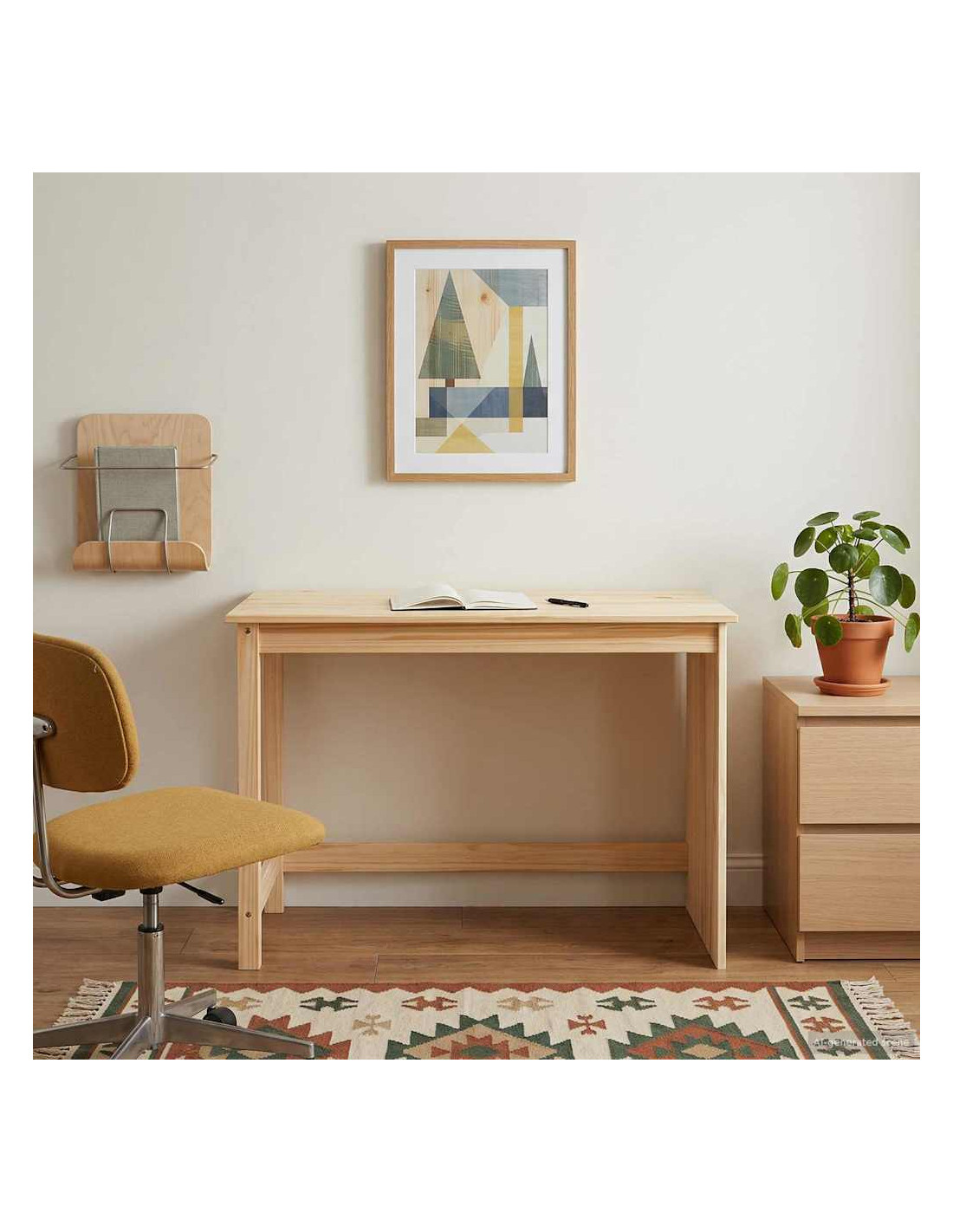 Questa scrivania minimalista unisce eleganza e funzionalità, diventando un elemento essenziale per uffici domestici o stanze studio. Con la sua forma rettangolare e il design semplice, offre un'estetica moderna e pulita. Perfetta per chi desidera uno spazio di lavoro libero da disordine, offre abbastanza superficie per un laptop, libri e penne. Il suo design classico si integra bene in ambienti minimalisti e contemporanei, aggiungendo un tocco discreto ma accattivante a qualsiasi stanza. Struttura in legno massello di pino Le gambe, il telaio e la superficie sono realizzati in legno massello di pino, noto per resistenza e durevolezza. Questo materiale assicura che la scrivania regga l'uso quotidiano e mantenga la sua robustezza in qualsiasi ambiente interno. Le venature del pino aggiungono calore al design minimalista. Elegante finitura opaca La superficie della scrivania ha una finitura opaca, donandole un aspetto liscio e sofisticato. Questo strato non riflettente non solo migliora il look generale ma offre anche una qualità tattile resistente a impronte e macchie, mantenendo il suo aspetto in ordine nel tempo. Forma rettangolare pratica Con dimensioni di 112 x 50 x 75 cm, questa scrivania offre spazio ampio per attività come scrittura e lavoro al computer. Le sue dimensioni la rendono adatta a stanze piccole, garantendo comunque un'area di lavoro funzionale. Spazio di lavoro definito È creato per uffici domestici, studio o postazioni informali nel soggiorno, offrendo flessibilità con un design semplice che supporta lavoro concentrato e utilizzo versatile a casa. Chiari benefici di manutenzione Per pulirla, basta usare un panno umido, evitando prodotti chimici aggressivi. Questa routine semplice aiuta a mantenere la qualità e la durata della scrivania, garantendo soddisfazione a lungo termine.