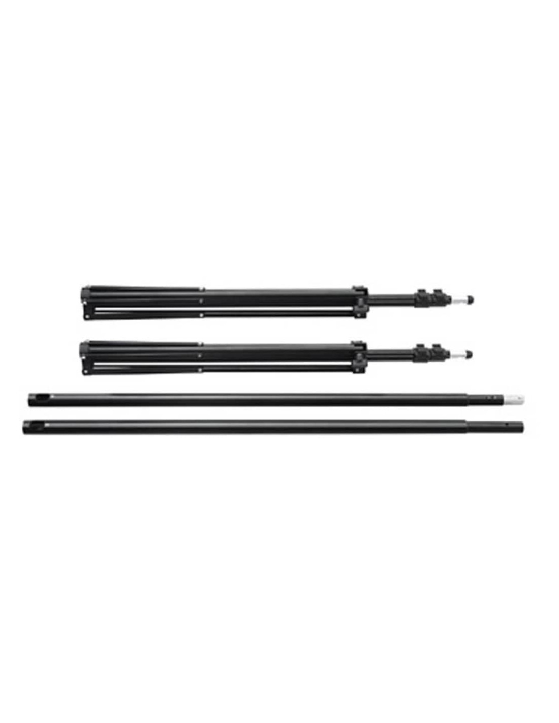 Uno sfondo di cotone nero è incluso in questo sistema. Il sistema può anche essere utilizzato in combinazione con altri fondali e/o rotoli di carta. Questo flessibile sistema di sfondi è adatto per la fotografia di ritratti, la fotografia commerciale e la fotografia da tavolo. Lo sfondo ha una larghezza massima di 300 cm e l'altezza può variare tra 75 e 210 cm. Se si desidera utilizzare il sistema sul posto, questo non dovrebbe rappresentare alcun problema.