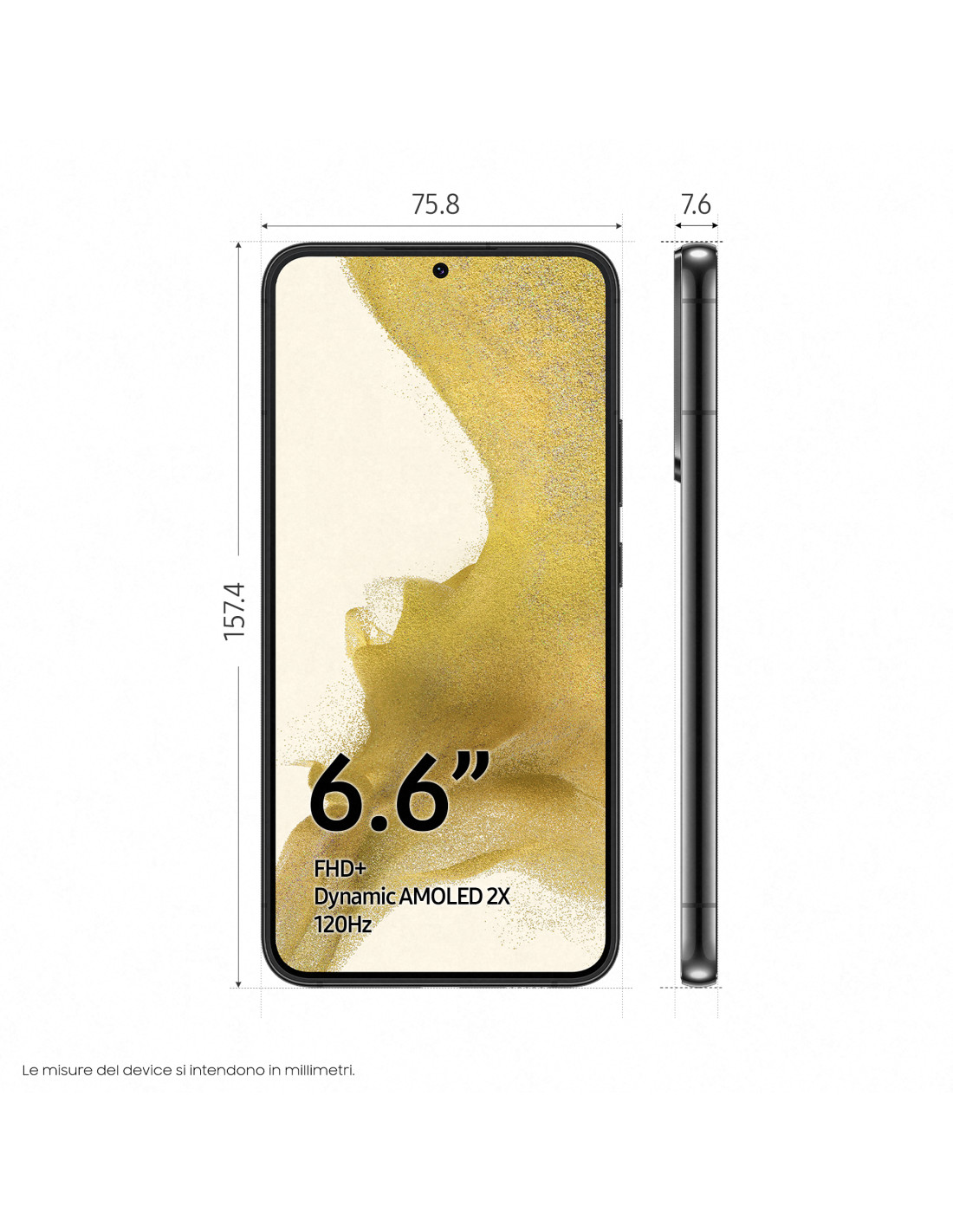 1_Misurato diagonalmente, la dimensione schermo di Galaxy S22+ è di 6.6” considerando l’intero rettangolo e di 6.4” esclusi gli angoli stondati; l’area visualizzabile effettiva è inferiore per la presenza degli angoli stondati e del foro della fotocamera.