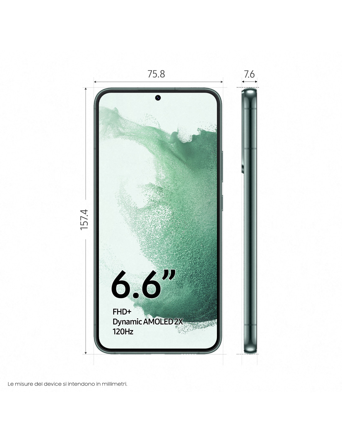 1_Misurato diagonalmente, la dimensione schermo di Galaxy S22+ è di 6.6” considerando l’intero rettangolo e di 6.4” esclusi gli angoli stondati; l’area visualizzabile effettiva è inferiore per la presenza degli angoli stondati e del foro della fotocamera.