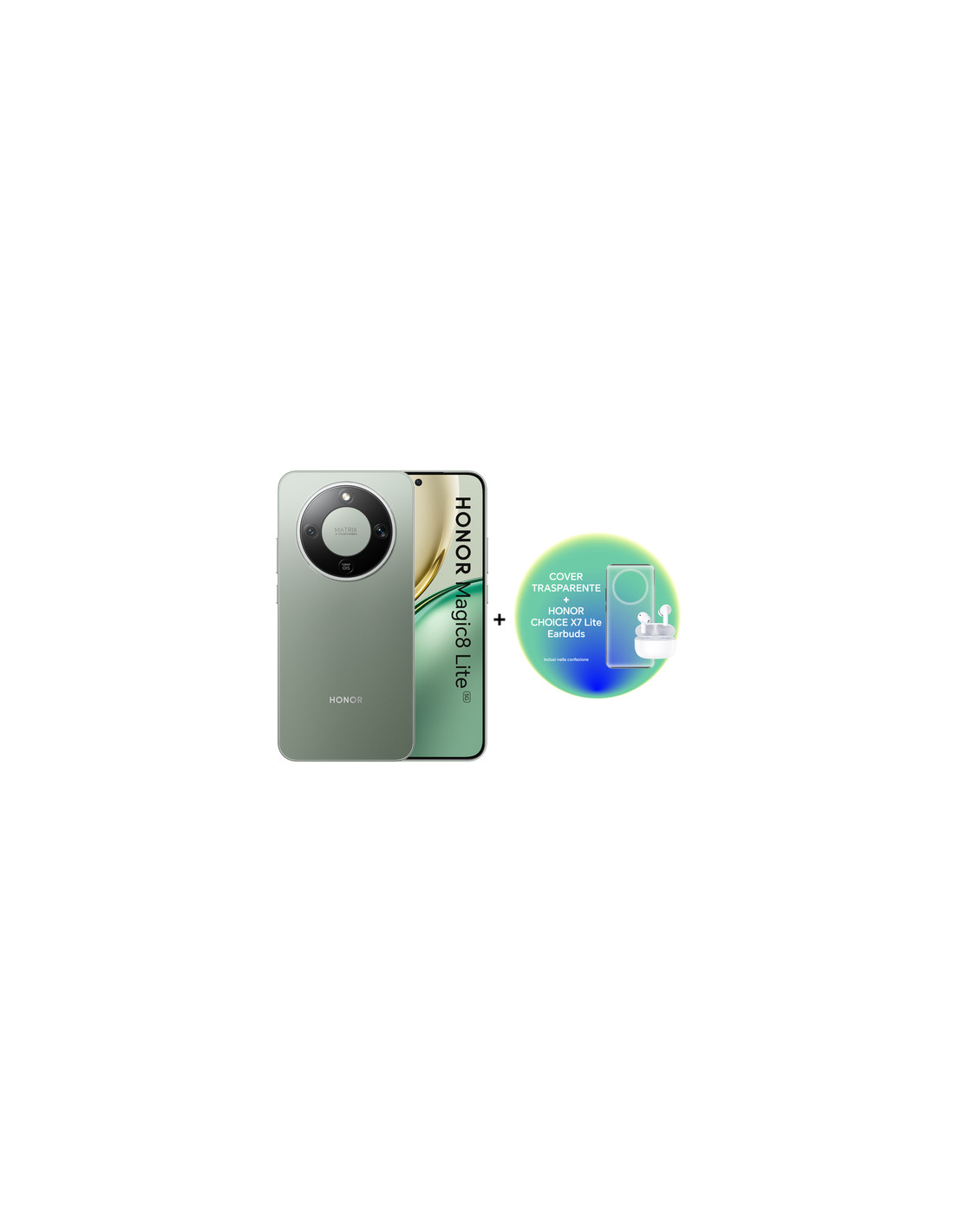 Honor Magic8 Lite 5G. Dimensioni diagonale schermo: 17,2 cm (6.79"), Risoluzione del display: 1200 x 2640 Pixel. Famiglia processore: Snapdragon, Modello del processore: 6 Gen 4. Capacità della RAM: 8 GB, Capacità memoria interna: 256 GB. Risoluzione fotocamera posteriore (numerico): 108 MP, Tipo di fotocamera posteriore: Doppia fotocamera. Sistema operativo incluso: MagicOS 9.0. Capacità della batteria: 7500 mAh. Colore del prodotto: Verde. Peso: 189 g