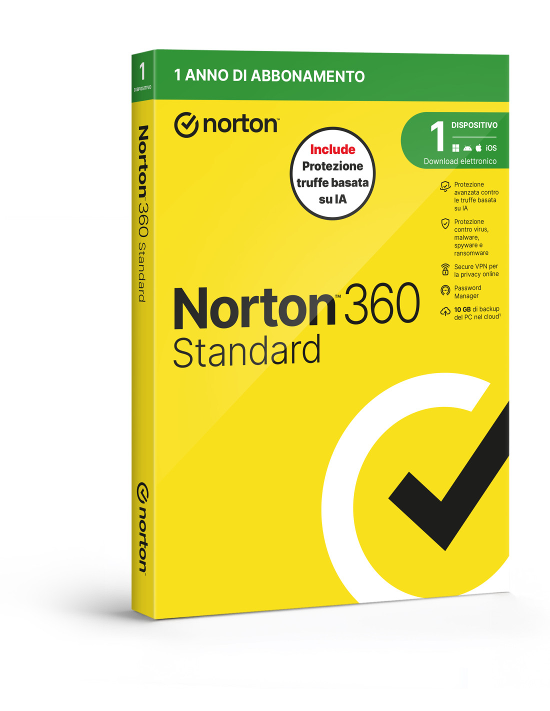 Norton 360 Standard protegge dai virus e offre 10GB di spazio cloud per 1 dispositivo. Ideale contro le frodi online, valido per 12 mesi.