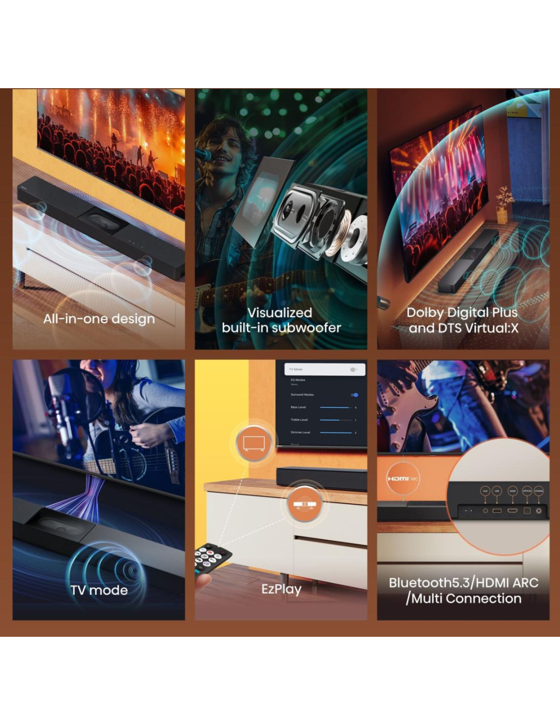 Hisense HS2000. Sistema audio: 2.1 canali, Potenza in uscita (RMS): 240 W, Formato audio integrato: DTS Virtual:X, Dolby Digital, Dolby Digital Plus. Potenza RMS dell'altoparlante soundbar: 240 W. Gamma di frequenza subwoofer: 50 - 60 Hz. Tecnologia di connessione: Con cavo e senza cavo. Tensione di ingresso AC: 100 - 240 V, Consumo energetico del soundbar: 240 W