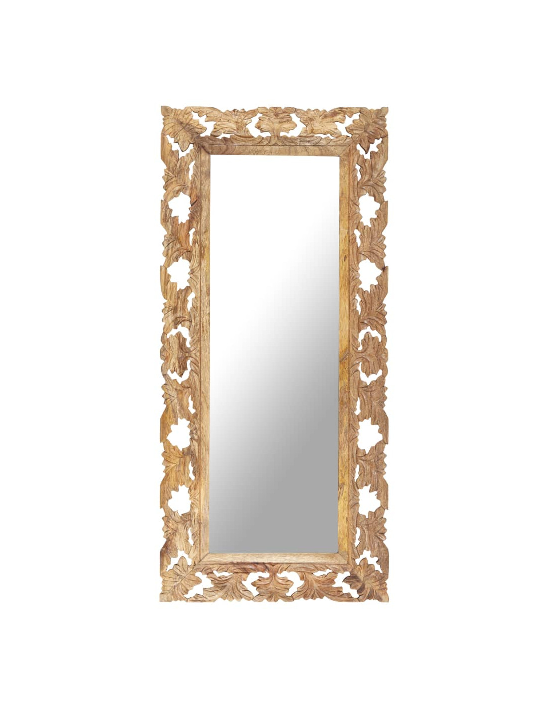 Il legno massello di mango è un legno duro tropicale. Ha la forza di sopportare il peso e resiste all'usura del tempo. Inoltre, la squisita fattura e le belle venature del legno rendono ogni specchio leggermente diverso dagli altri. Il motivo intagliato a mano aggiunge bellezza allo specchio.