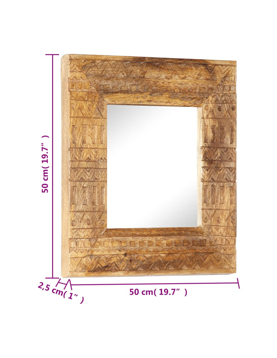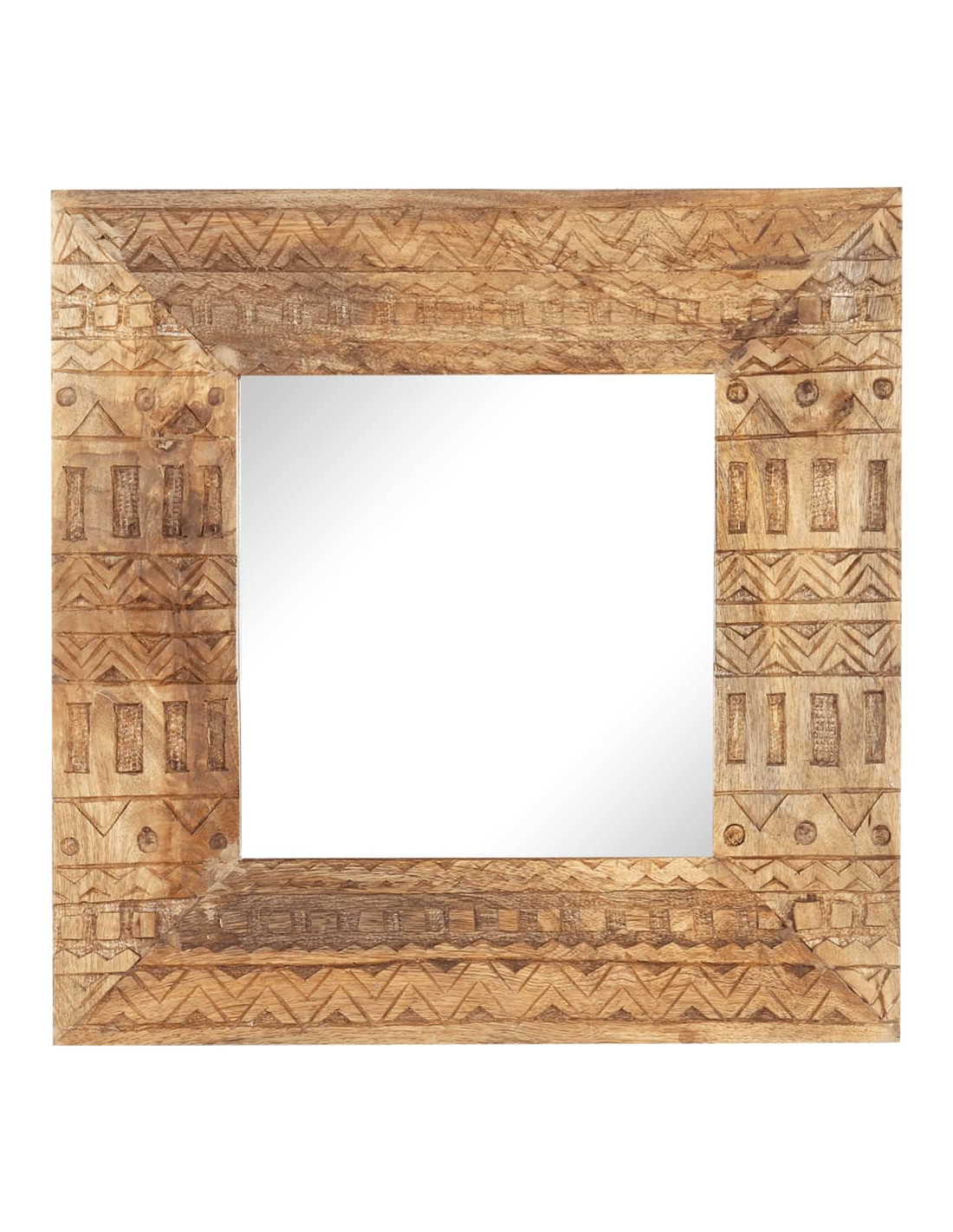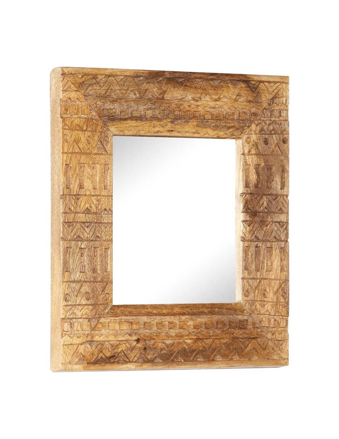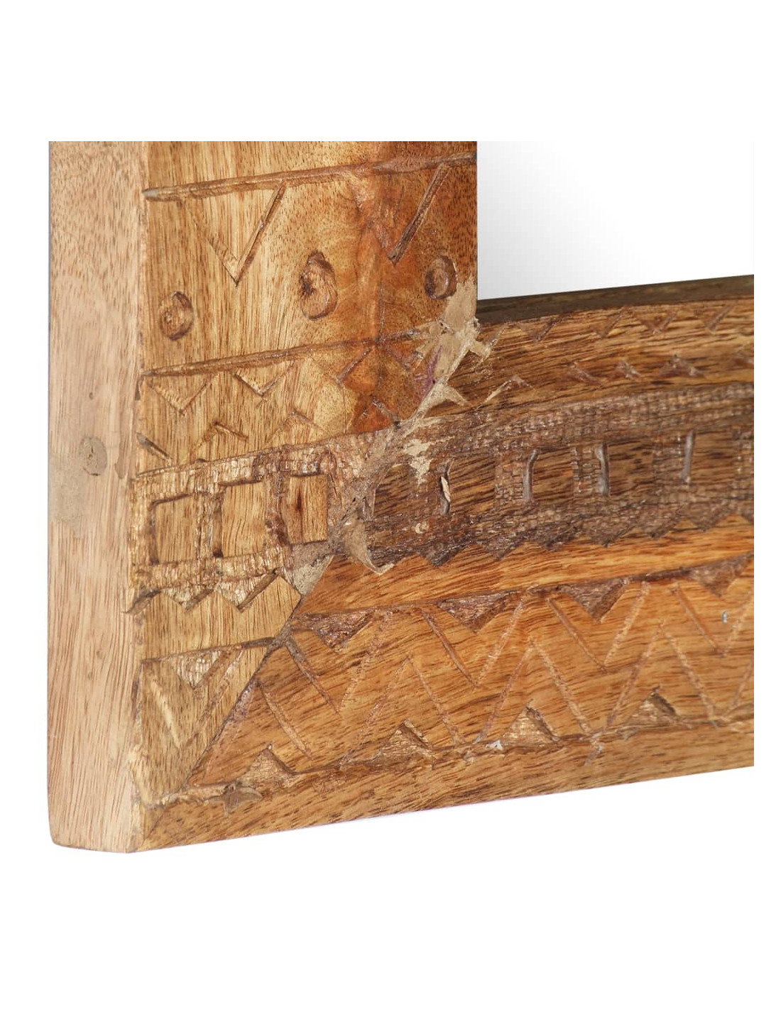 Questo specchio è realizzato in legno massello di mango, un legno duro tropicale con la forza di sopportare il peso. Inoltre, resiste all'usura del tempo, essendo stabile e durevole. La lavorazione artigianale e le bellissime venature del legno rendono ogni pezzo unico e leggermente diverso dall'altro. Inoltre, il motivo intagliato a mano ne aumenta la bellezza.