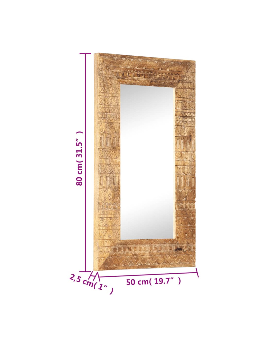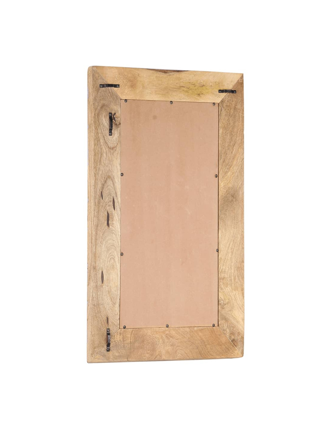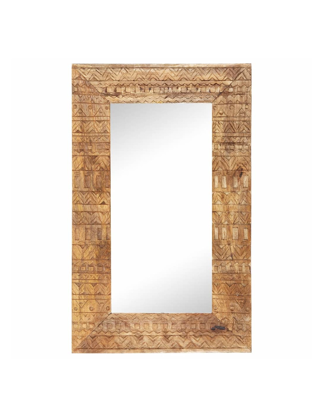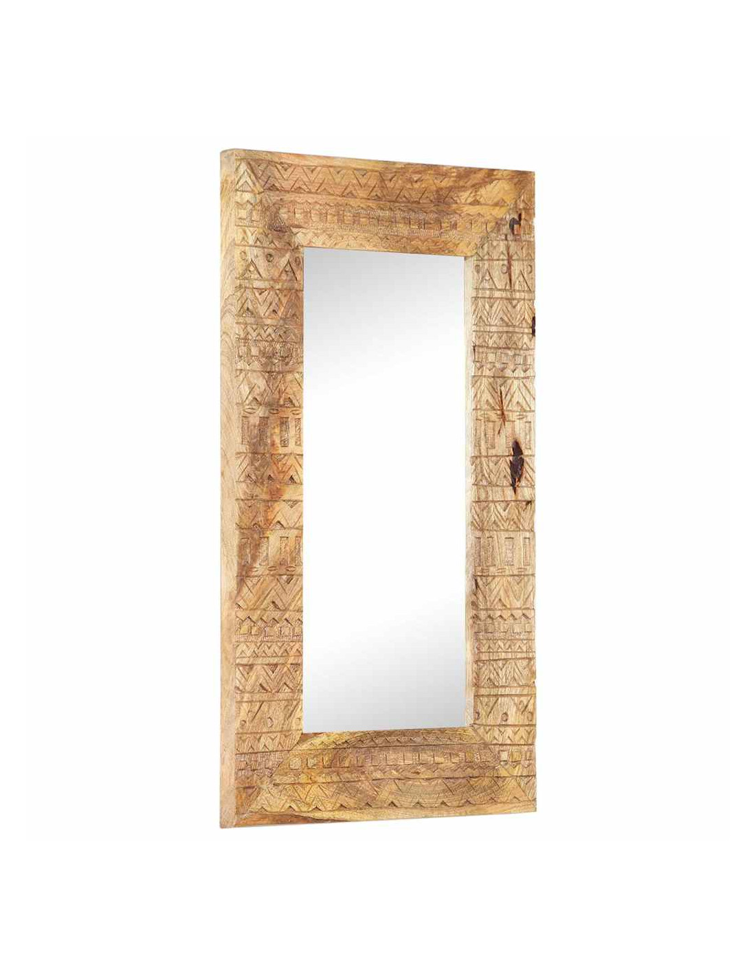 Questo specchio è realizzato in legno massello di mango, un legno duro tropicale con la forza di sopportare il peso. Inoltre, resiste all'usura del tempo, essendo stabile e durevole. La lavorazione artigianale e le bellissime venature del legno rendono ogni pezzo unico e leggermente diverso dall'altro. Inoltre, il motivo intagliato a mano ne aumenta la bellezza.