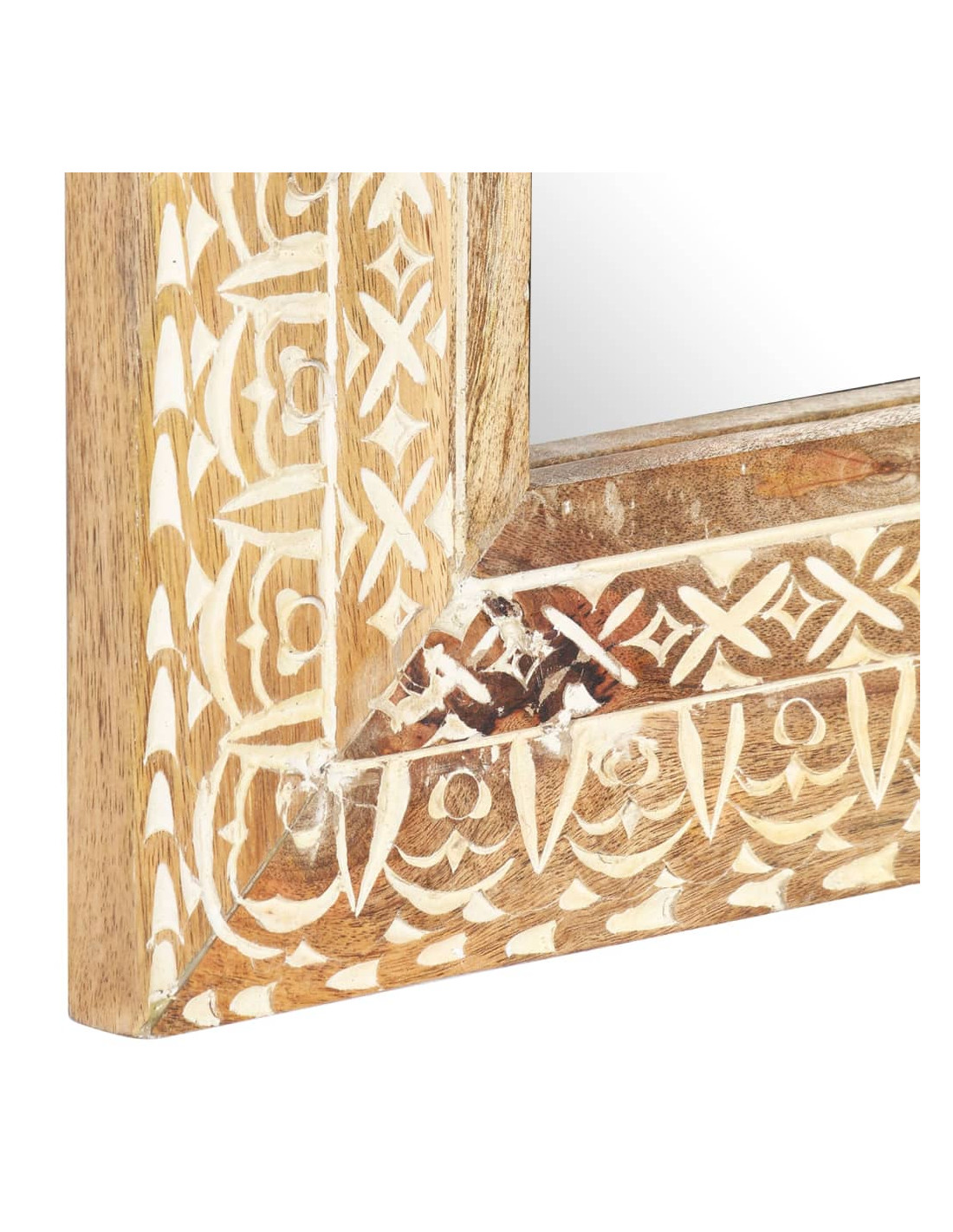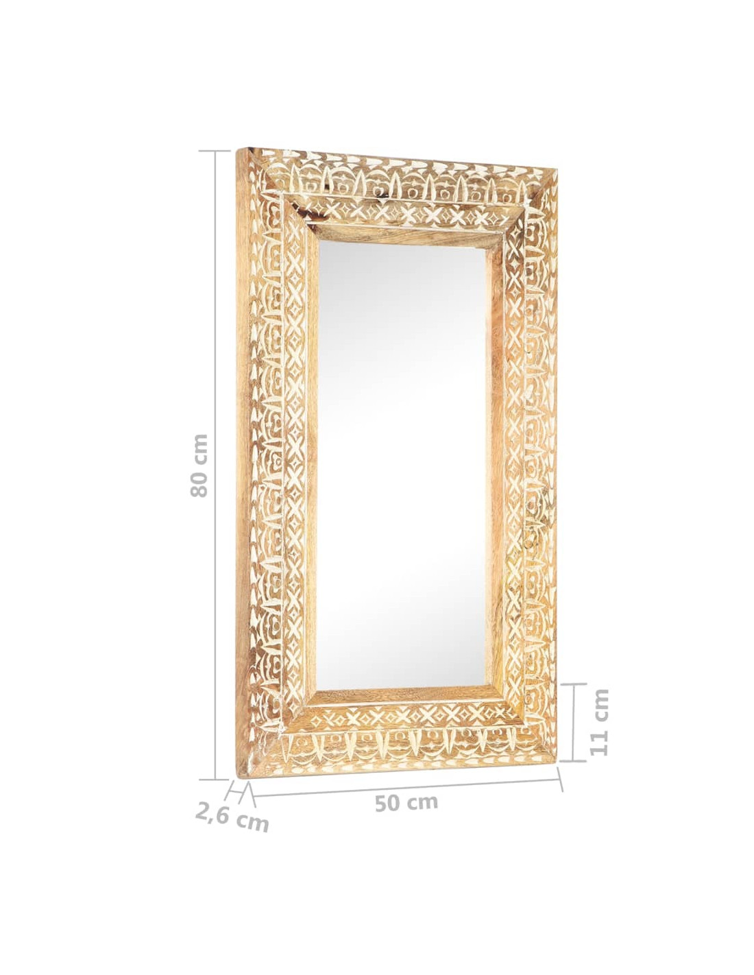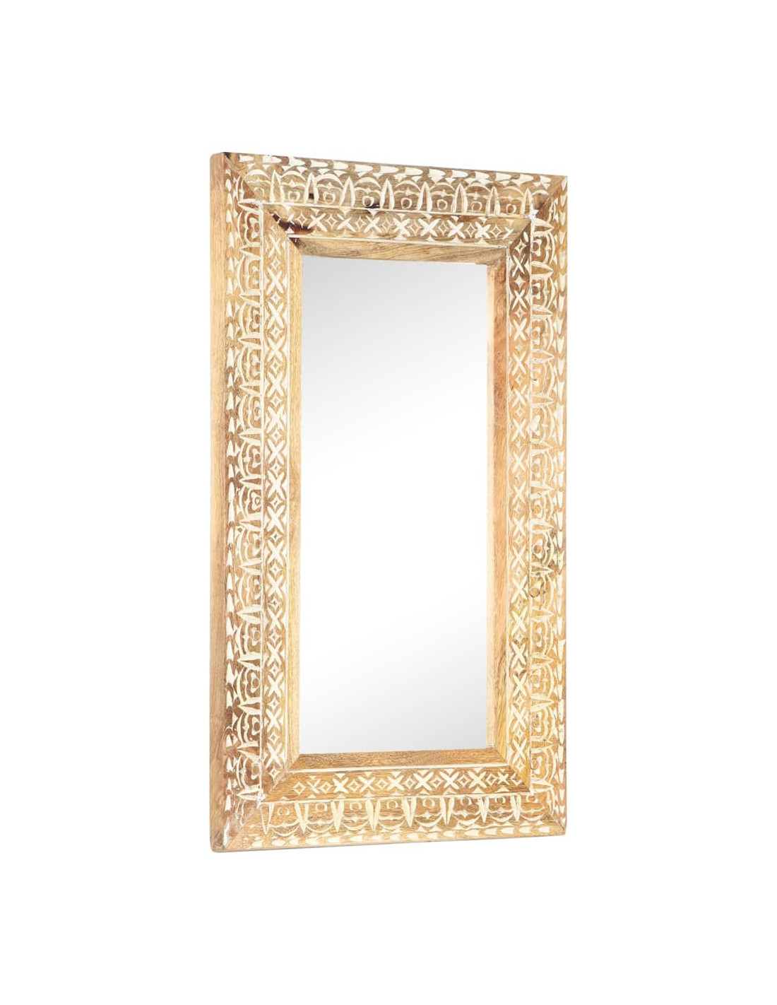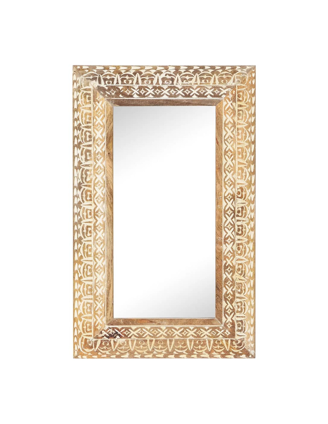Questo specchio è realizzato in legno massello di mango, un legno tropicale che si caratterizza per la forza di sopportare pesi elevati. Inoltre è resistente all'usura del tempo, risultando pertanto robusto e durevole. La lavorazione artigianale e le bellissime venature del legno rendono ogni pezzo unico e leggermente diverso dal successivo. Il motivo intagliato a mano va ad accentuare il suo fascino.