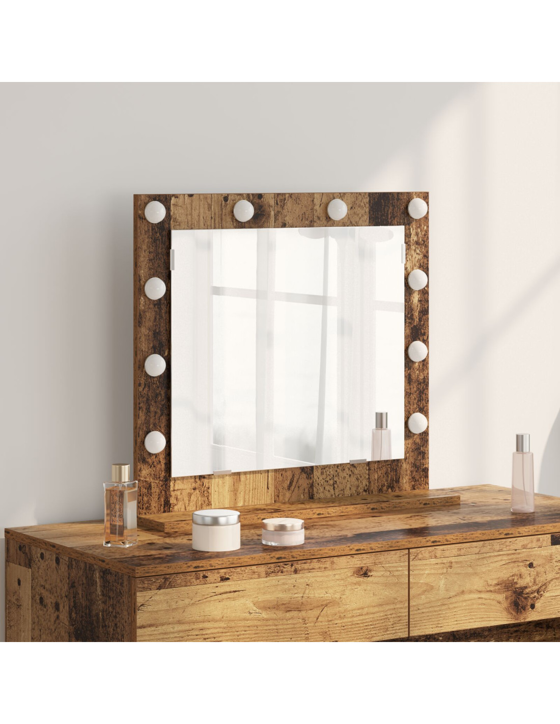- Materiali top: Questo specchio LED da trucco è realizzato con vetro e legno ingegnerizzato, offrendo look elegante e resistenza. Il vetro assicura una superficie riflettente perfetta, mentre la base in legno garantisce solidità, rendendolo un'opzione robusta per l'uso quotidiano.